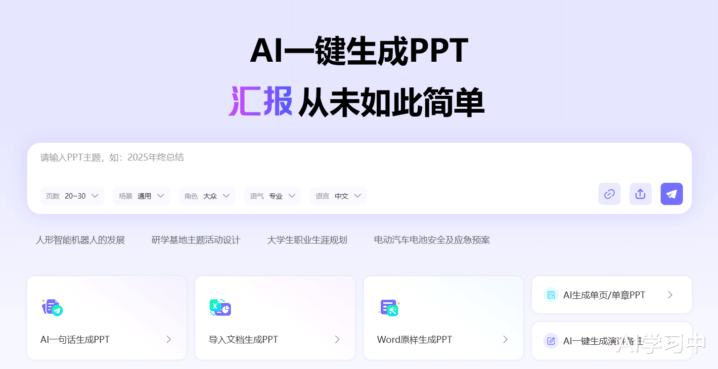 - 多入口启动PPT:支持通过输入主题、上传多种格式文档(Word/Excel/PDF)或抓取网页URL来生成PPT初稿,适配从零构思或已有材料的各类场景。