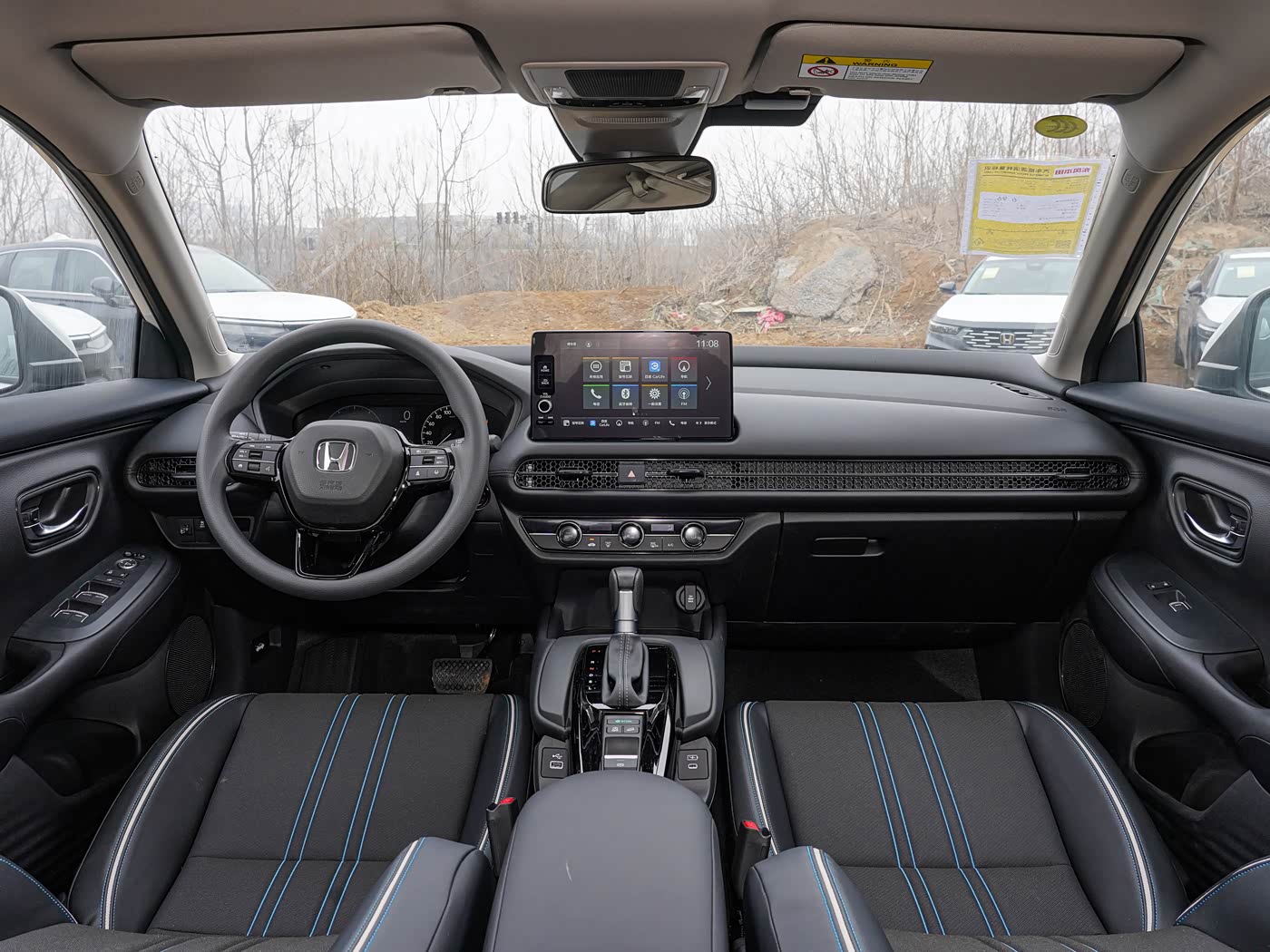 途岳新锐内饰以“功能优先”为设计理念,对称式中控台搭配悬浮式9.2英寸中控屏(高配为10.3英寸全液晶仪表),实体空调按键与机械挡把的保留提升了盲操便利性。双拼撞色内饰(黑红/黑灰)与红色装饰条点缀打破沉闷,座椅采用皮质与织物混搭,支撑性良好。配置方面,1.5L锐享版标配主驾电动座椅、前排座椅加热、无线充电、双区自动空调等实用功能,后排座椅支持比例放倒,后备厢容积可扩展至1543L,满足家庭出行需求。HR-V内饰则强调“空间魔术师”理念,平直中控台线条与贯穿式空调出风口拓展视觉宽度,10.1英寸悬浮式中控屏与10.2英寸全液晶仪表形成双屏联动,支持语音控制、手机远程操控与OTA升级。座椅采用皮织混搭材质,人体工程学设计提升包裹性,后排地台纯平设计与可调角度靠背进一步优化乘坐体验。配置上,除入门版外均搭载Honda SENSING安全超感系统,包含ACC自适应巡航、碰撞缓解制动等功能,顶配车型增加盲点监测与倒车车侧预警,安全性能更全面。