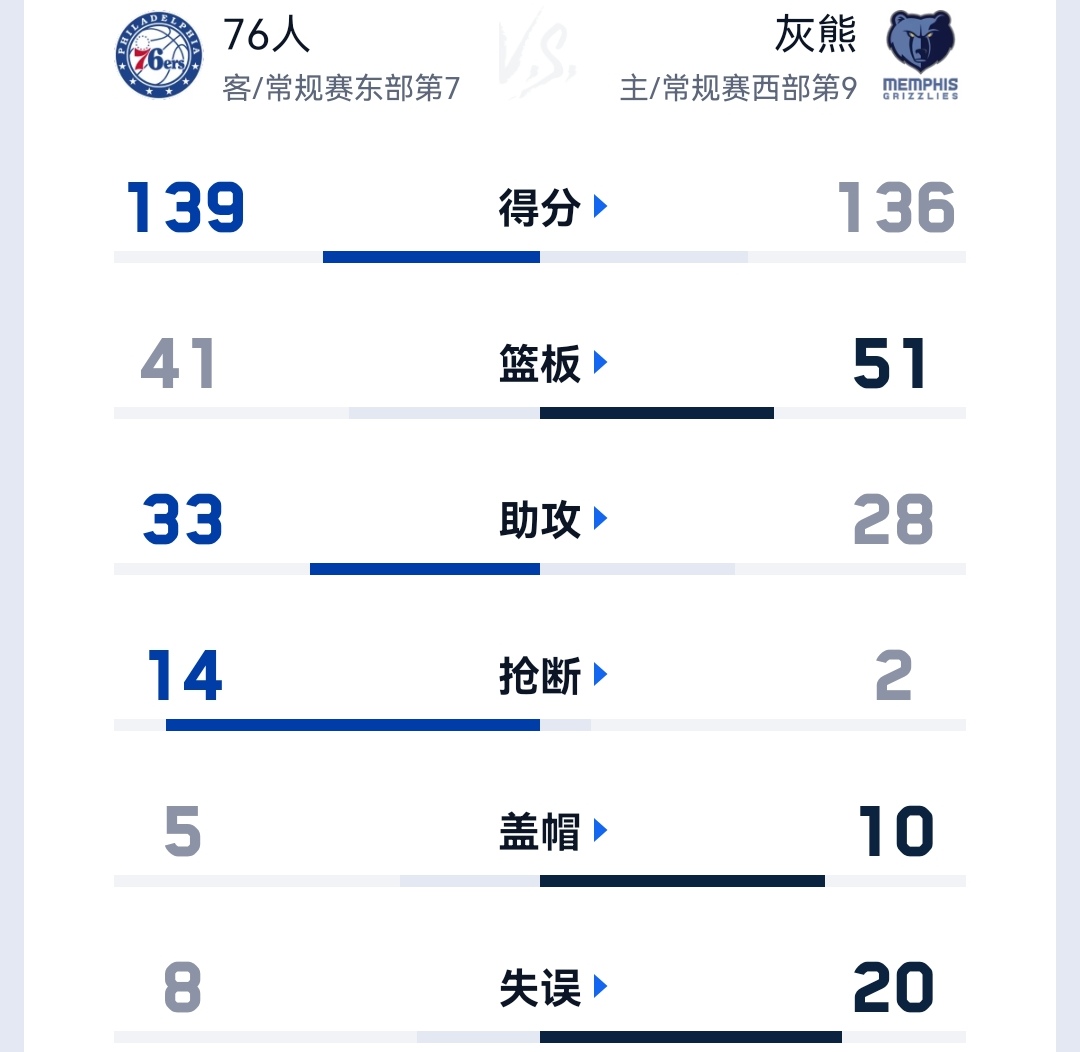全队数据来看,灰熊抢到了51个篮板,但仍然没有赢球,输球的原因就是失误太多,多达20次,76人只有8次。失误太多,因而才让客队获得14次抢断。如果失误哪怕少一两个,恐怕赢球的就是灰熊了。
