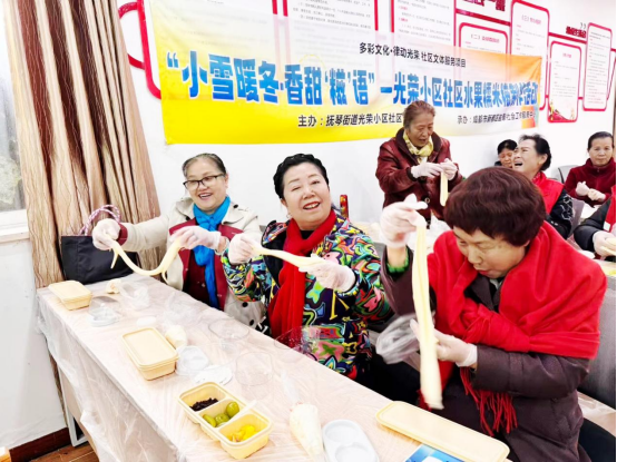 “小雪气寒而将雪矣,地寒未甚而雪未大也。”2025年11月19日上午9:30,在小雪节气来临之前,冬意渐浓,但在光荣小区社区晚霞养老服务中心活动室内,却是一派暖意融融、欢声笑语的景象。为弘扬中华优秀传统文化,丰富社区居民精神文化生活,增进邻里情感,四川省成都市光荣小区社区关工委联合益康社会工作服务中心开展了“小雪暖冬·香甜‘糍’语”——光荣小区社区水果糯米糍制作活动,吸引了20位社区居民热情参与。