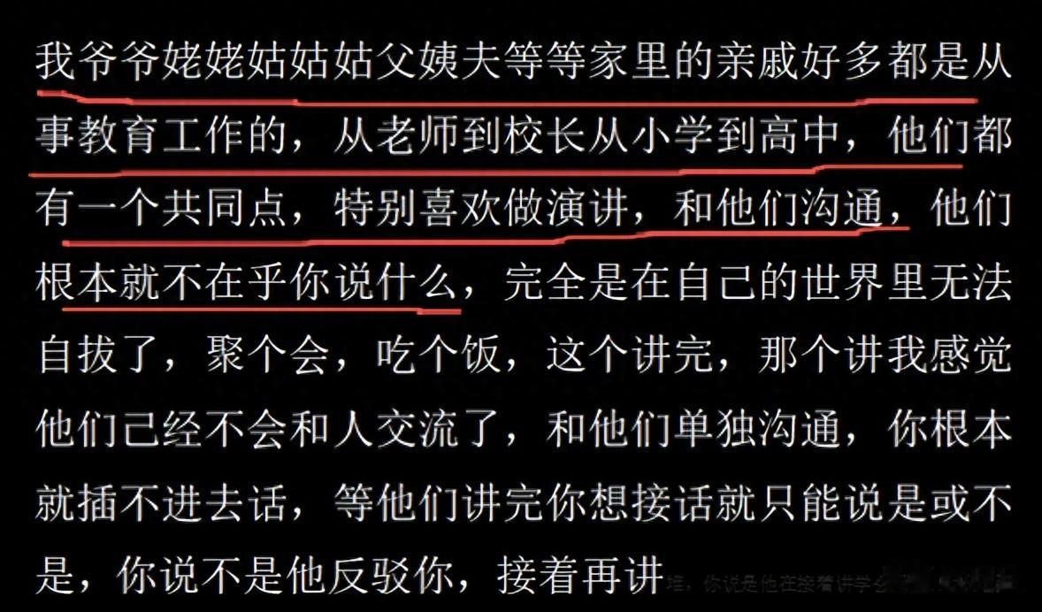 济南的网友分享,自己家里是教师世家,身边的长辈都是从事教育工作的,她们有一个共同点:喜欢演讲,根本不在乎你说什么!