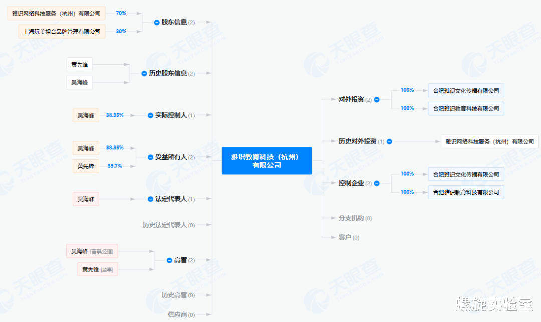 这还没过去一年,他就成了雅识教育主理人之一。天眼查App显示,雅识教育科技(杭州)有限公司有两家股东,上海玩美祖合品牌管理有限公司持有30%的股份。