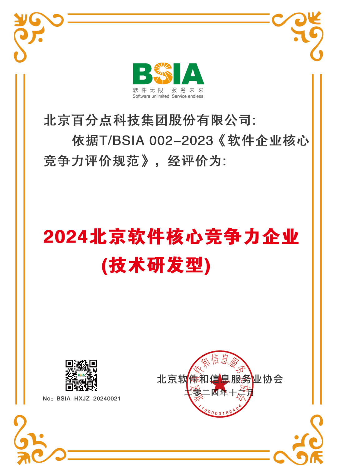 “北京软件企业核心竞争力评价”已经连续开展六年,根据《软件企业核心竞争力评价规范》(T/BSIA 002-2023)等标准,以软件企业的综合素质为基本要求,以产业带动力、技术创新力、市场影响力、业务前瞻性为评价指标,从企业规模、经营业绩、研发能力、创新成果、质量保证等方面进行评价。百分点科技凭借在大数据和AI领域的技术实力和创新能力,获评“北京软件核心竞争力企业——技术研发型”。