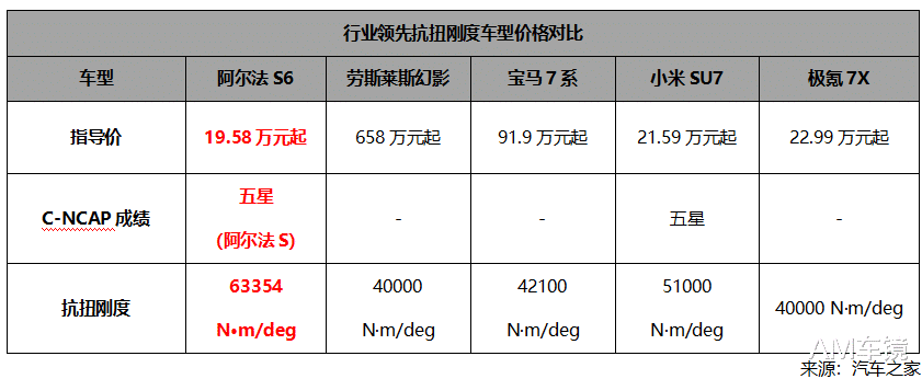 尤其是阿尔法S6,车身抗扭刚度高达63354N·m/deg,堪称全球量产车中扭转刚度第一车。阿尔法T6的车身刚扭刚度也达到了55000 N·m/deg。不仅碾压了小米 SU7 的 51000N·m/deg、宝马7系的 42100N·m/deg,甚至把劳斯莱斯幻影的40000N·m/deg远远甩在身后,是名副其实的业界“天花板”。阿尔法S6全车高强度材料占比高达90.18%,阿尔法T6高强度材料占比高达91.1%,A/B 柱和门槛均用的1500MPa 热成型钢,堪比坦克装甲。