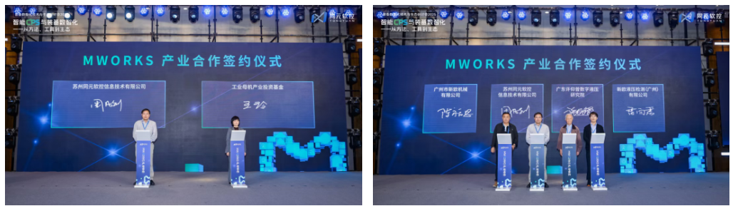 会议现场举行了生态合作签约仪式。同元软控与哈尔滨工业大学、哈尔滨工程大学、西安交通大学、中山大学、苏州大学、中北大学、长春理工大学、东北石油大学、江苏大学、齐鲁工业大学和兰州理工大学这全国首批11所高校签署战略合作协议,基于MWORKS共建教学与科研平台。同时进行了MWORKS产业合作签约,同元软控与工业母机产业投资基金开展战略合作,携手推进MWORKS在工业母机产业链的数字化应用;同元与广东许仰曾数字液压研究院 、广州市新欧机械有限公司、新欧液压检测(广州)有限公司签署合作协议,共同推进MWORKS在液压产业的数字化应用。