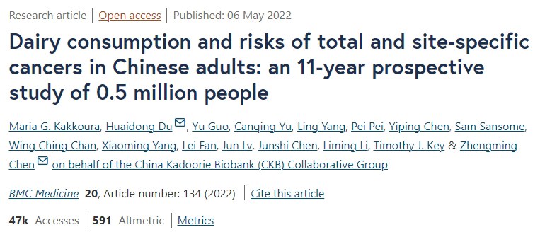 这篇发布在权威期刊《BMC Medicine》的研究,团队都是来自北京大学、中国医学科学院、牛津大学的研究人员,为了找出乳制品摄入量与患癌风险的关系,对51万+成年居民进行长达11年的随访调查,并按乳制品消费频率进行分组。
