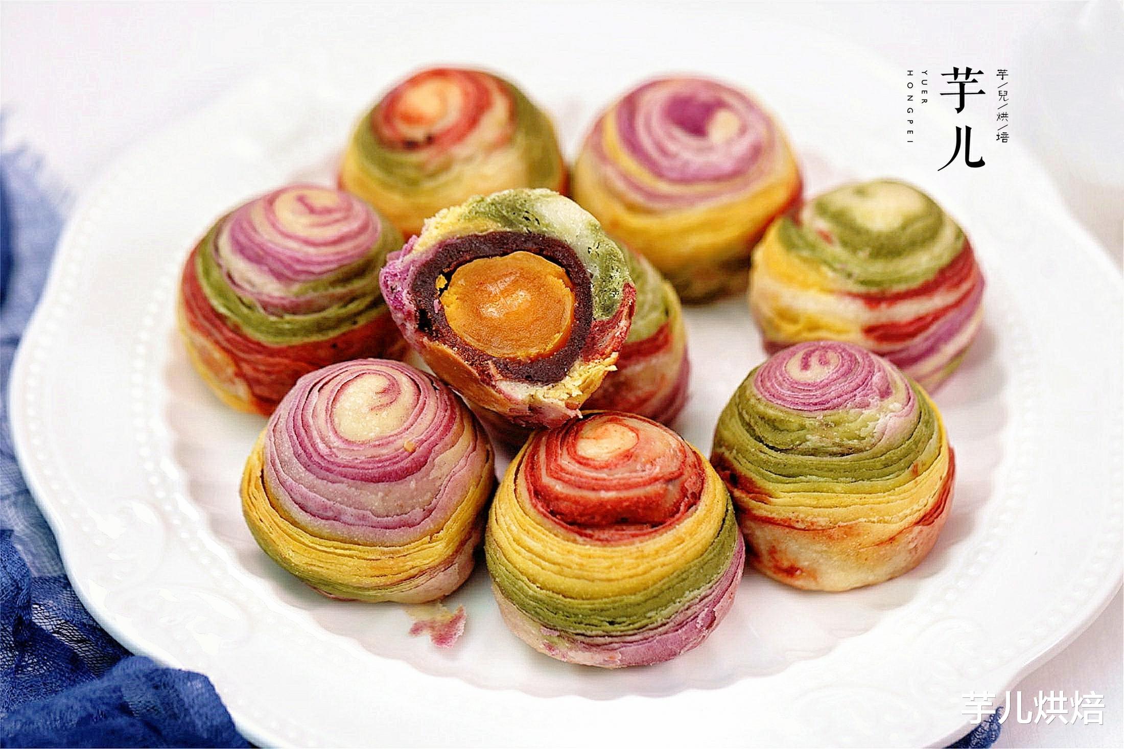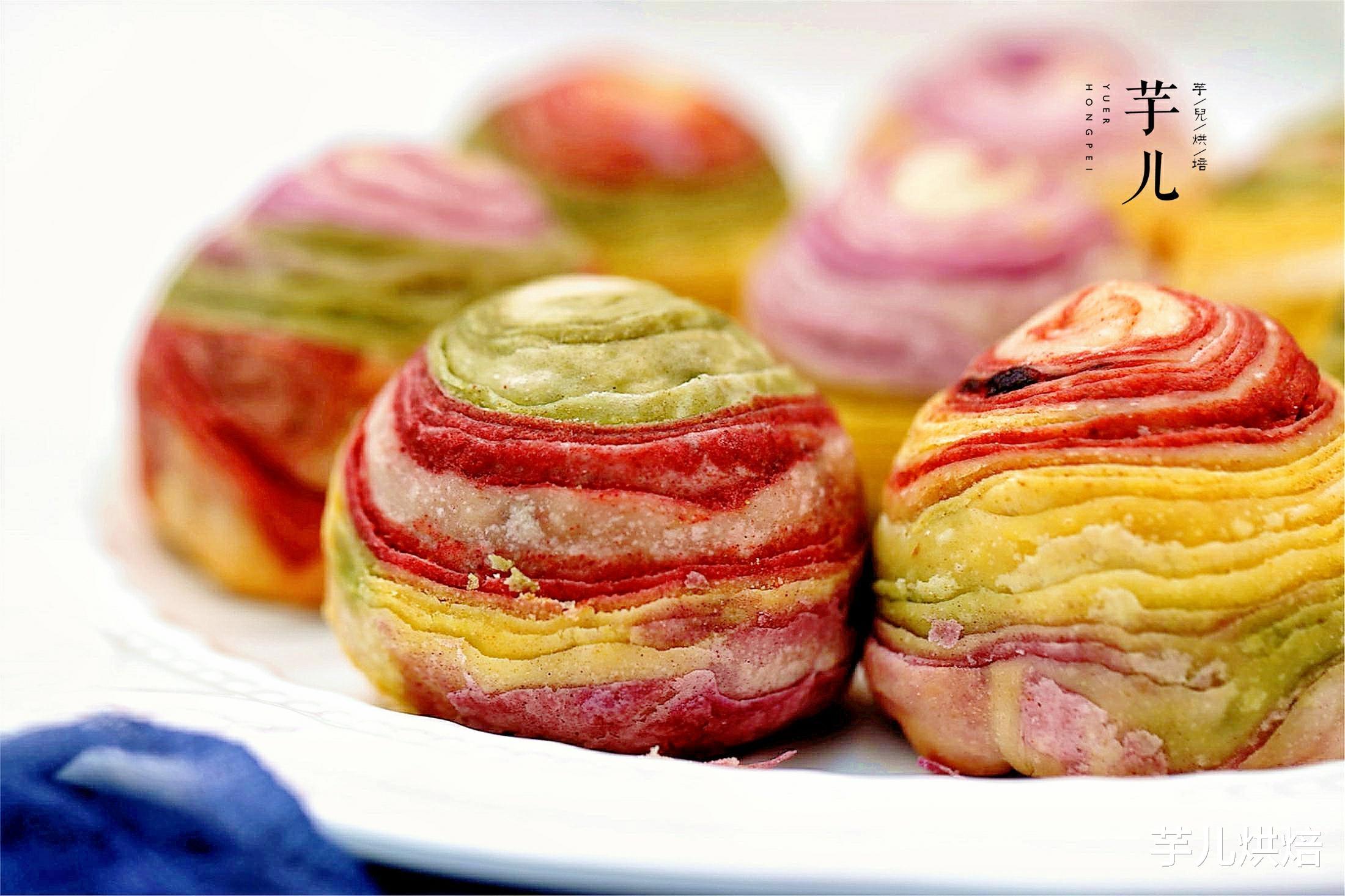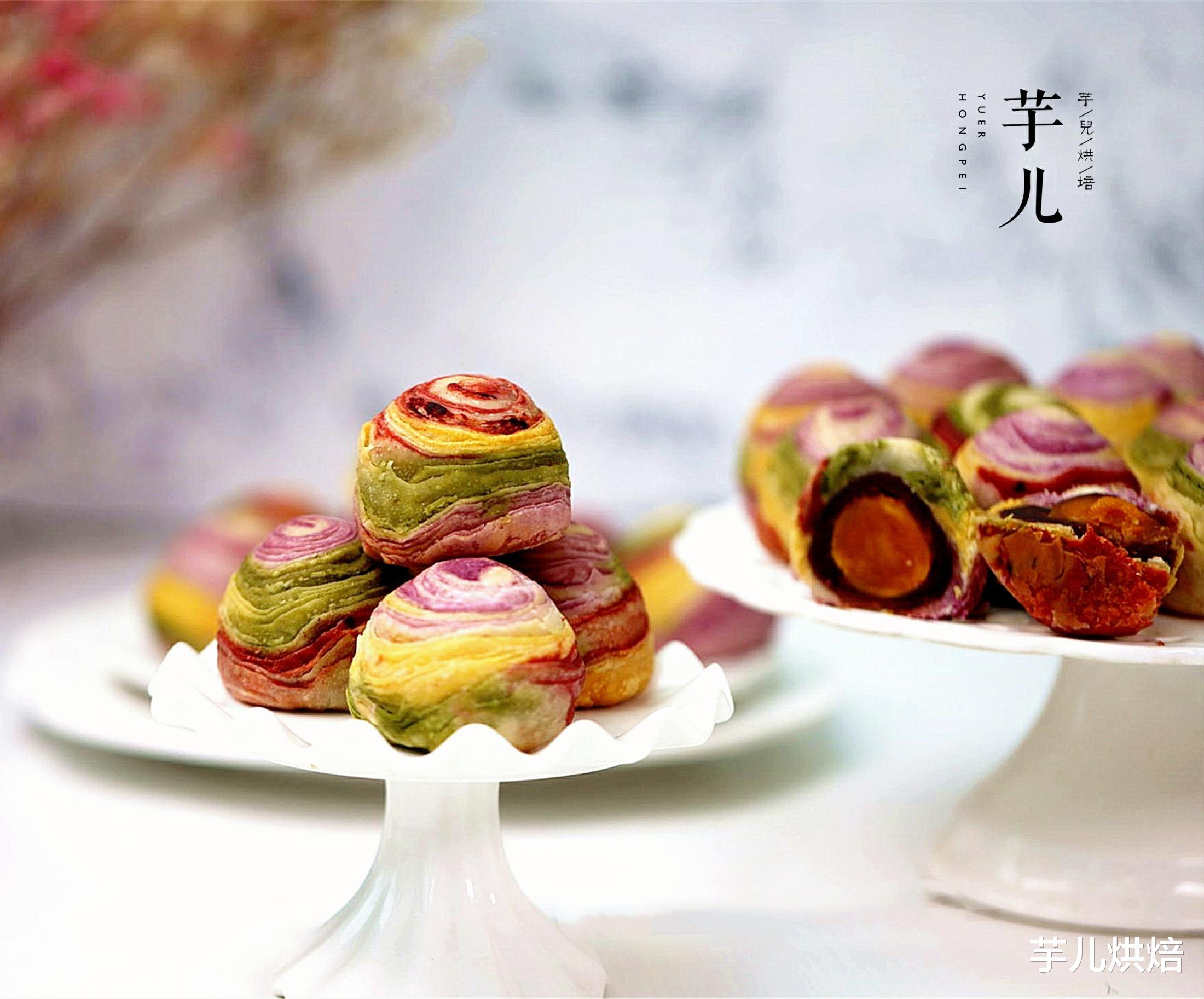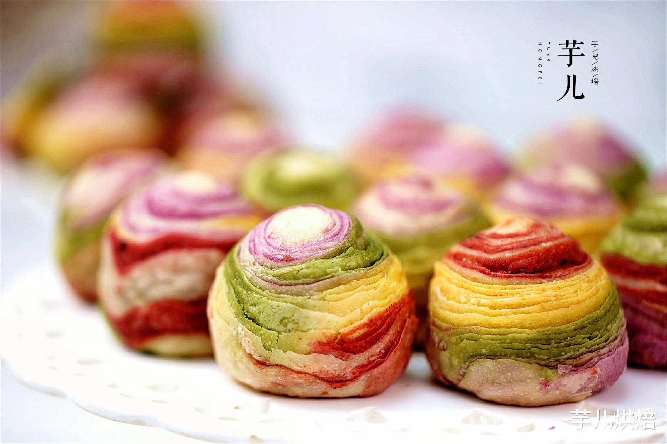 今天就给大家分享一款“彩色蛋黄酥”,这款蛋黄酥和传统的蛋黄酥不太一样,自带它独有的特色,拥有独一无二的风格,彩虹色的渐变酥皮,一层层环绕的五彩斑斓,化成了螺旋般的彩虹,一眼看到就觉得心情也像彩虹一样美丽了。一颗彩色蛋黄酥带给你是不仅仅只是味蕾上的满足,更是视觉上的极大享受!