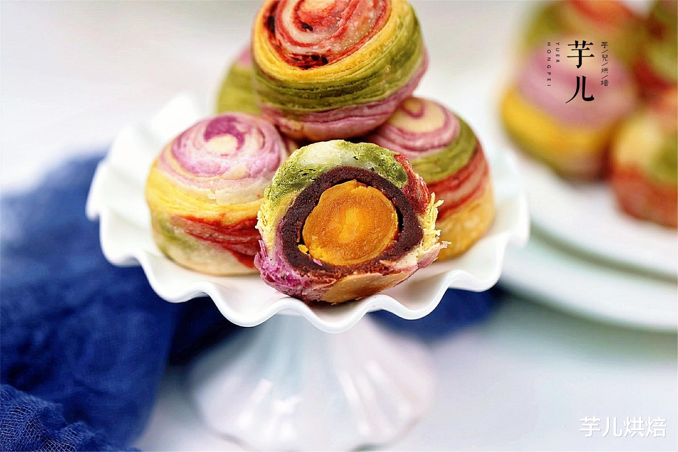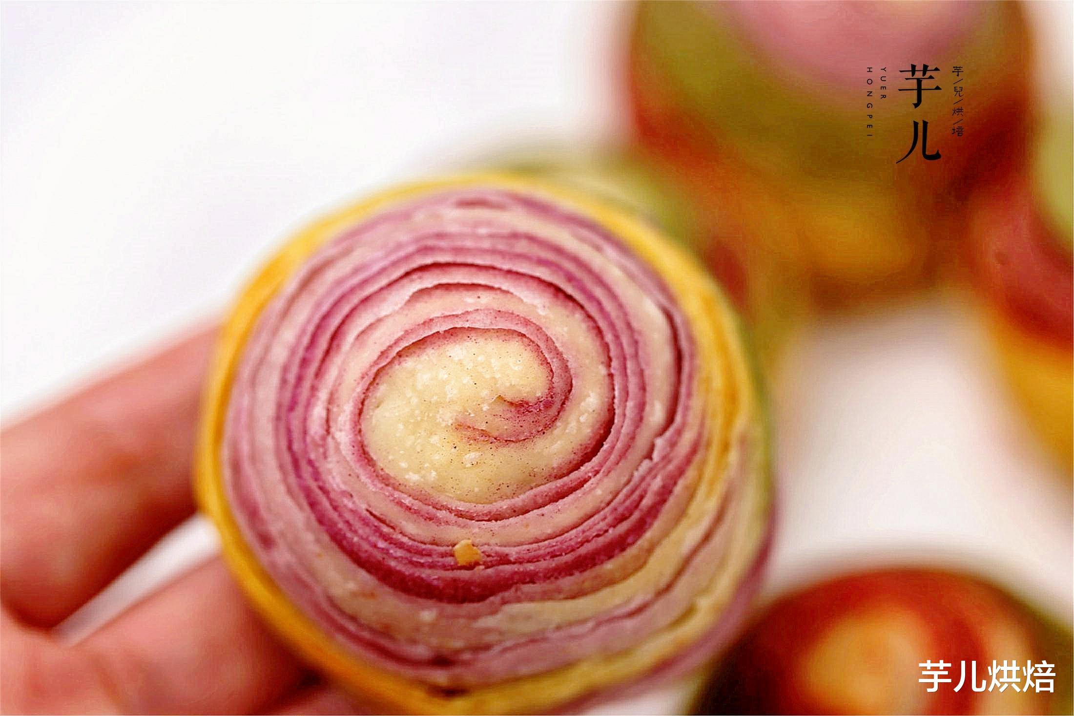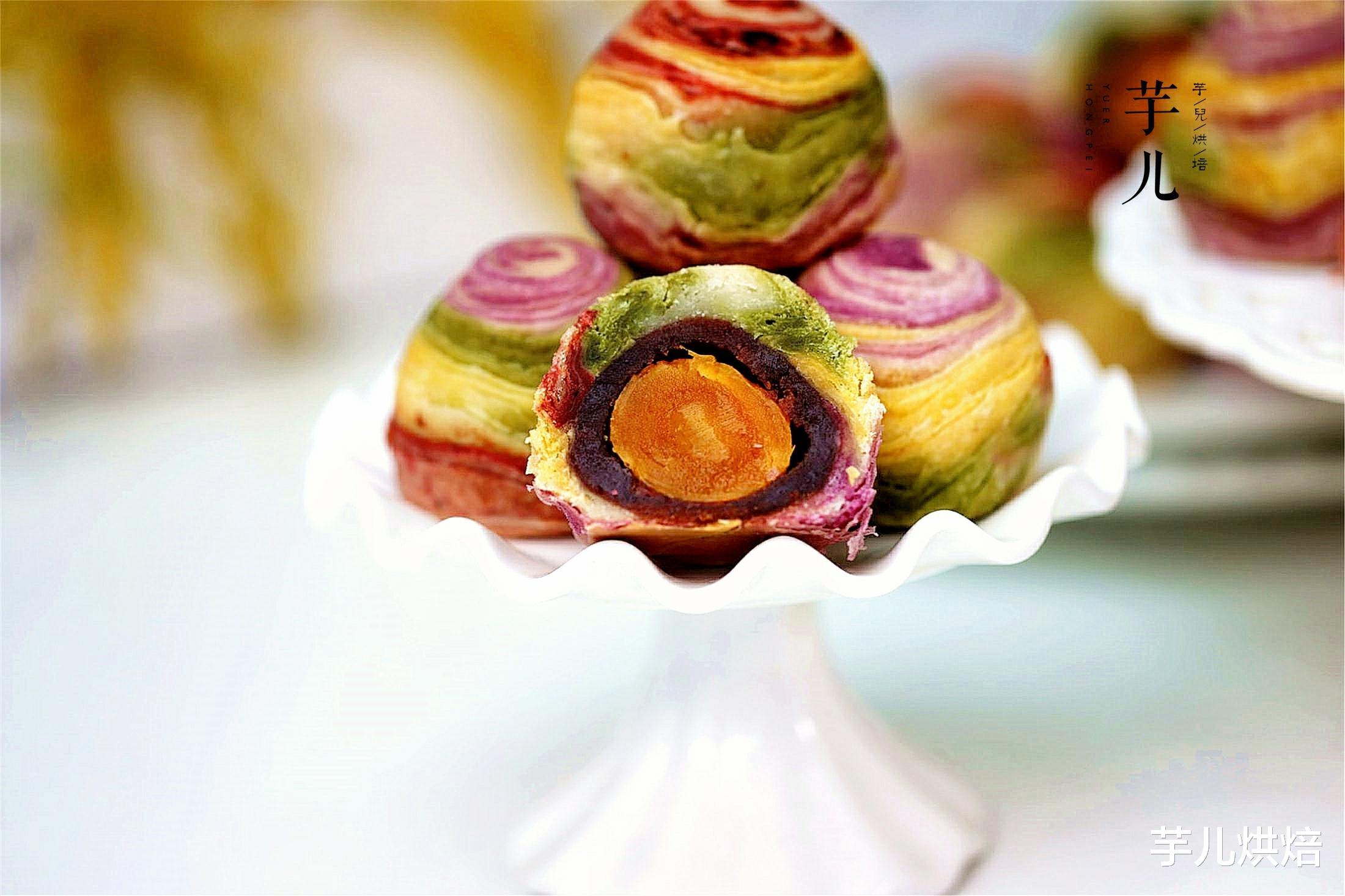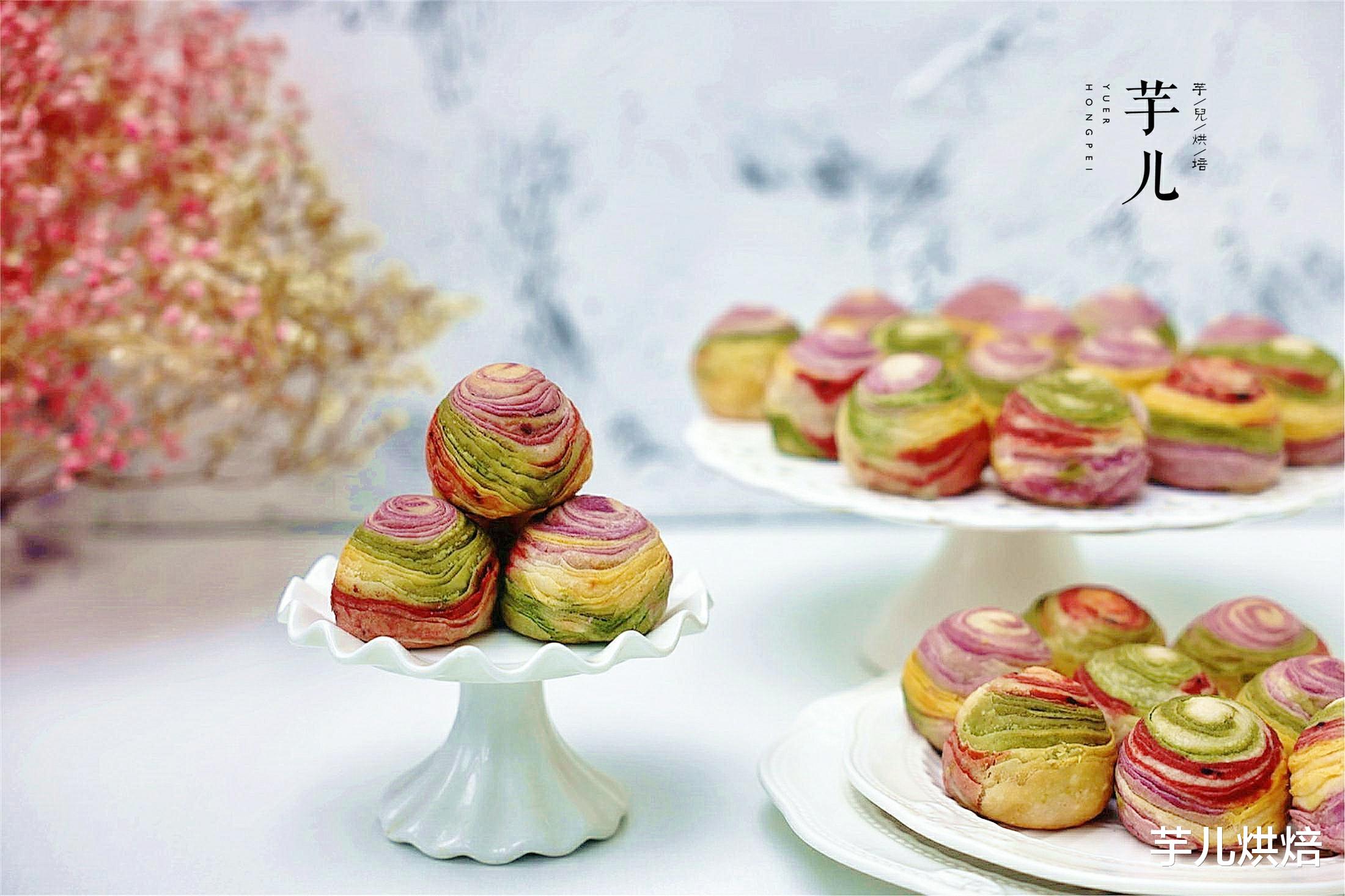 今天就给大家分享一款“彩色蛋黄酥”,这款蛋黄酥和传统的蛋黄酥不太一样,自带它独有的特色,拥有独一无二的风格,彩虹色的渐变酥皮,一层层环绕的五彩斑斓,化成了螺旋般的彩虹,一眼看到就觉得心情也像彩虹一样美丽了。一颗彩色蛋黄酥带给你是不仅仅只是味蕾上的满足,更是视觉上的极大享受!