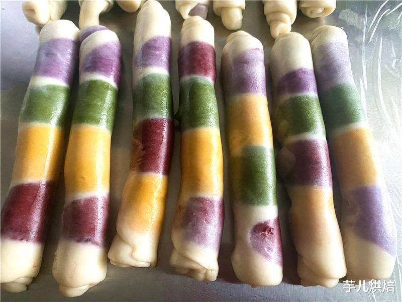 10.陆续将面团全部卷好,放一旁,盖上保鲜膜松弛20分钟。