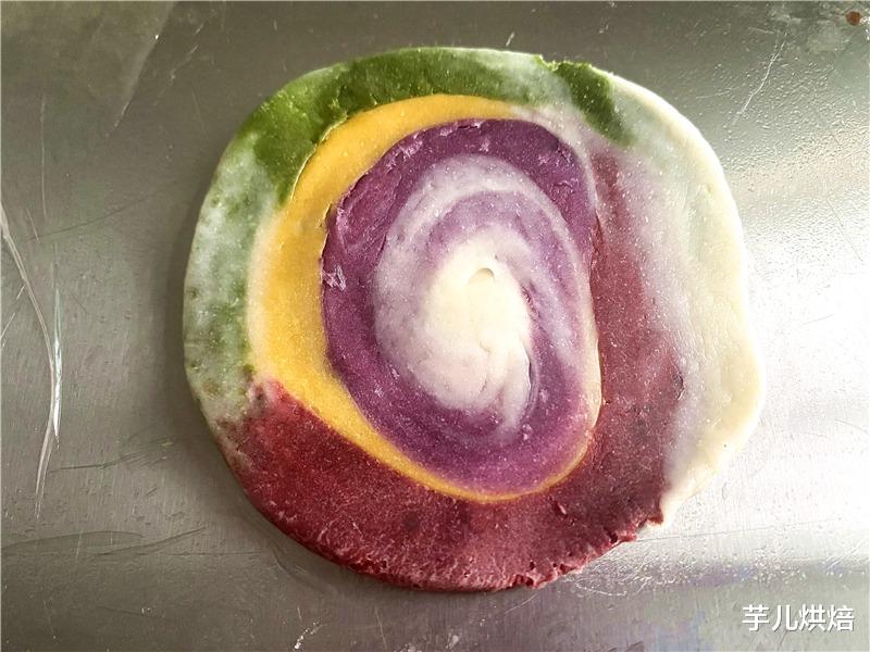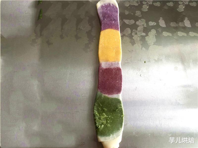 8.将包裹好的面团,横放,用擀面杖轻轻擀开。用力要均匀,不然擀成的面团色彩不均匀。
