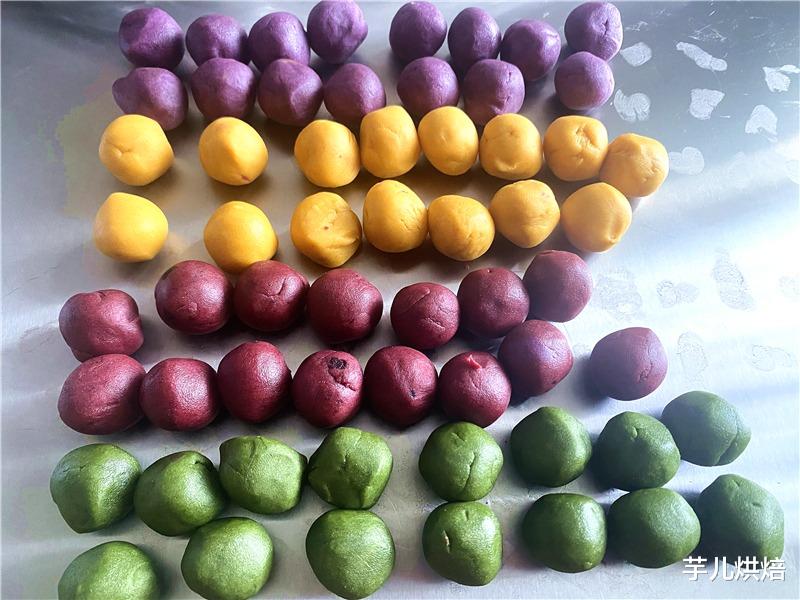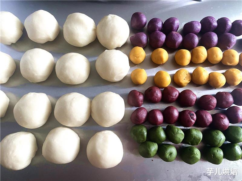 6.将醒发好的油皮分成25份,再将4色油酥每一色平均分成15等份。