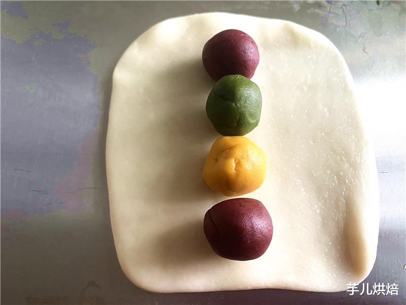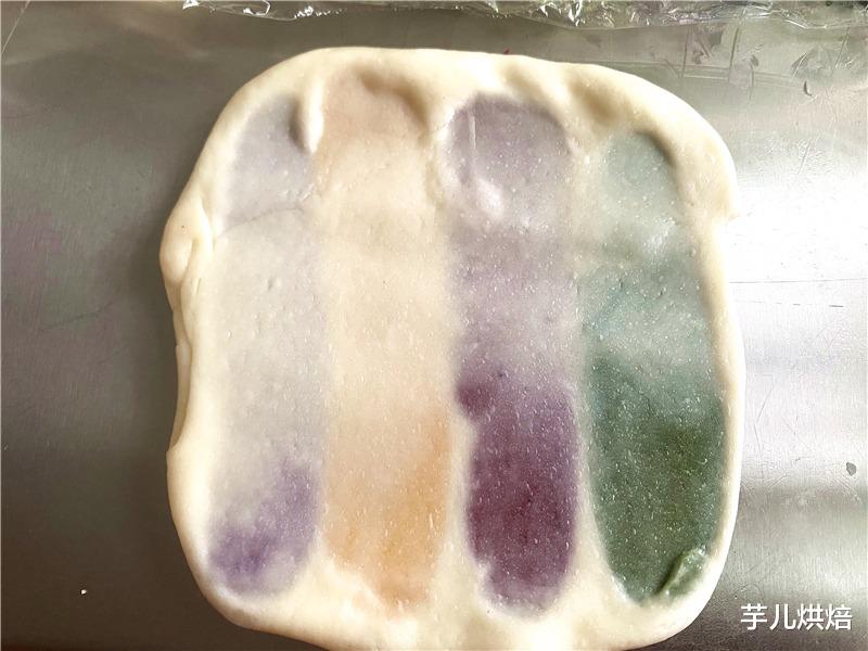 7.取来一块油皮面团擀成长方形,放上4色油酥。油酥可以随便摆放,不同摆放位置,做出来的油酥色彩就不同。再将水油皮从两边将油酥完全包裹。