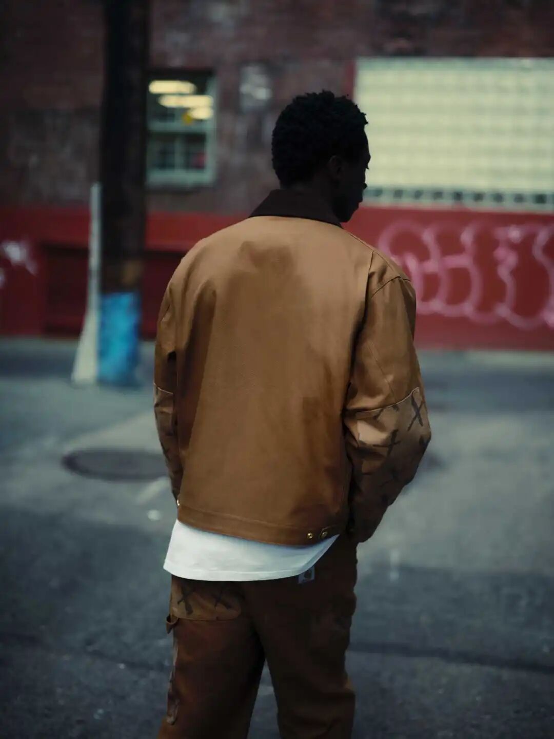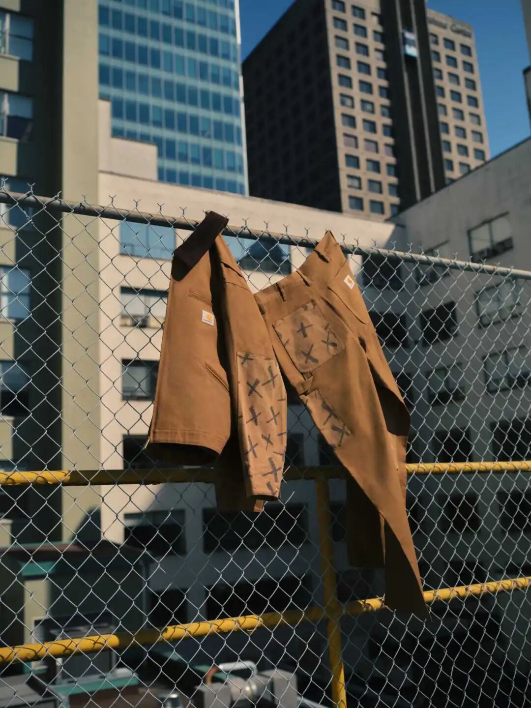 外套 OG Detroit Jacket 采用 Carhartt WIP 标志性硬朗轮廓,手肘处加双层布料呼应经典工装细节,呈现坚实实用的设计感。裤装 Double Knee Pant 则以双膝布工装裤为基础,通过立体剪裁提升舒适度,拼接不同水洗层次的啡色帆布,展现丰富视觉层次;背部的 “X” 印花将街头元素融入工装实用性中,形成兼具耐用性与时尚感的造型语言。