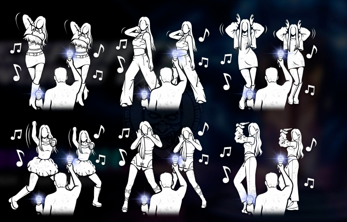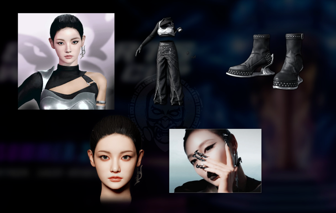 角色外观方面,四位成员的专属皮肤均采用原版歌曲MV中的同款打歌服设计。总结起来就是黑不溜秋,穿得不多。看起来每个成员都有联动的脸,妆容、名牌、衣服和头像。