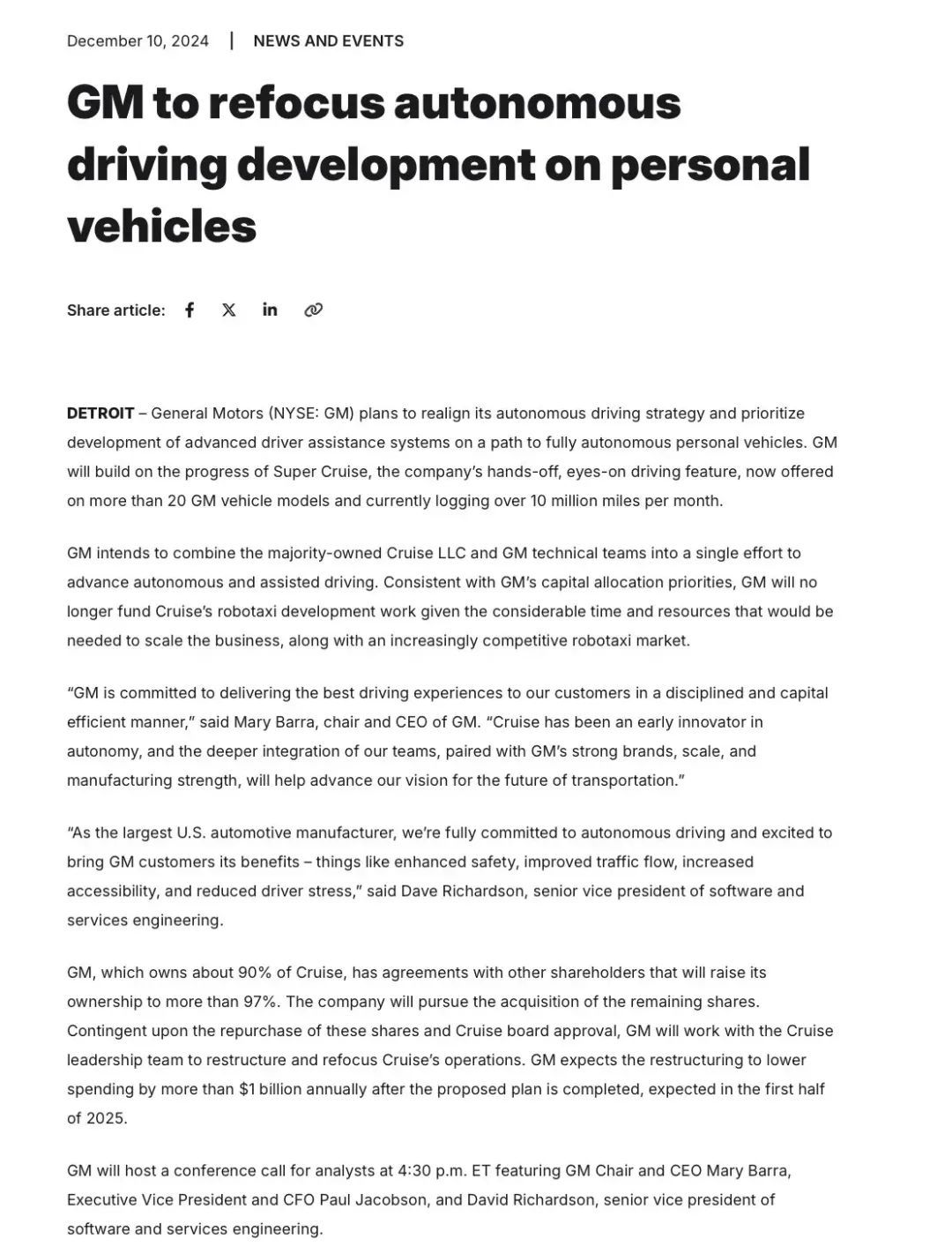在L4自动驾驶技术强势复苏,众多玩家纷纷排队上市的背景下,北美时间周二下午,通用汽车却突然宣布终止对Cruise的Robotaxi业务投资。通用汽车CEO玛丽·博拉解释称,这一决定并非抛弃Cruise,而是通用汽车自动驾驶发展战略的彻底转变。通用汽车将从之前笃信的L4和Robotaxi转向在乘用车上量产高阶智能驾驶系统,通过数据迭代逐步实现完全自动驾驶,这一战略调整与特斯拉的发展路径不谋而合。