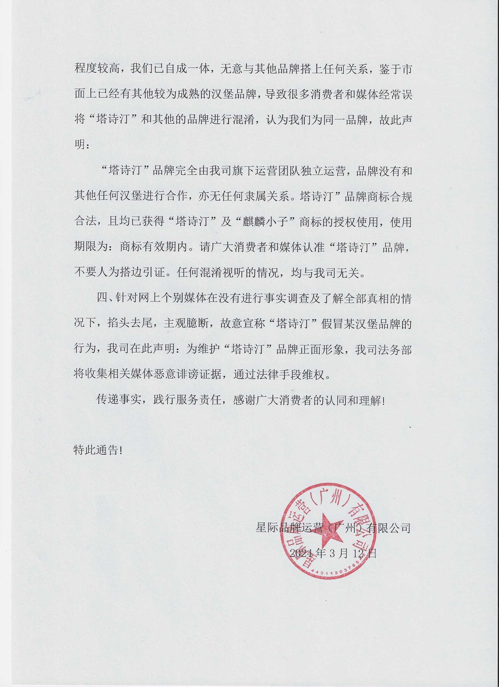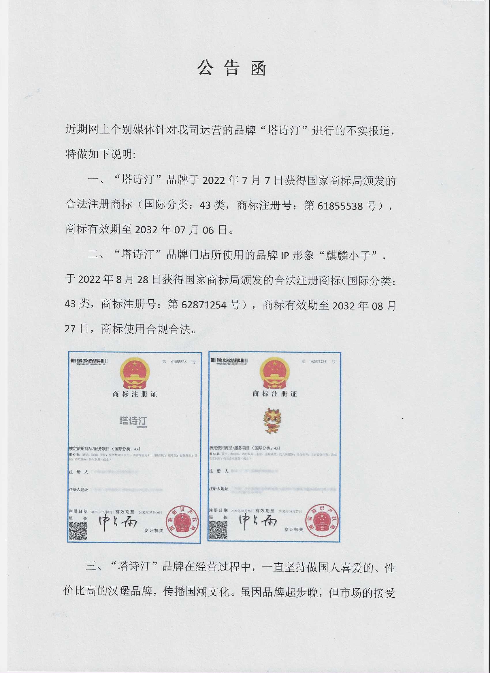 首先,我们郑重声明,“塔诗汀”品牌是我司独立运营的品牌,拥有完整的自主知识产权。自品牌创立以来,我们始终坚守诚信经营的原则,致力于为广大消费者提供优质的汉堡产品和服务。我们的品牌商标“塔诗汀”及门店所使用的品牌IP形象“麒麟小子”均已经获得国家商标局的合法注册,并获得了相应的商标注册证书,商标使用合规合法。