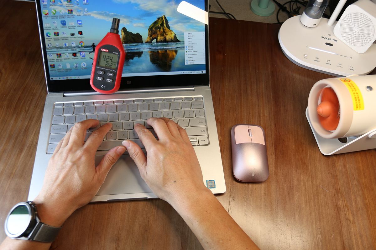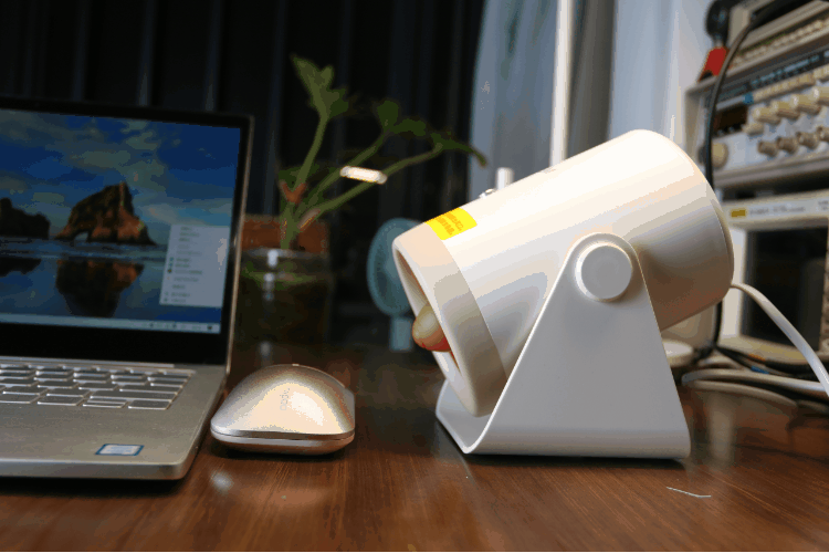 现在我们来体验一下。生活在南方地区的朋友,冬天没有供暖,这时候在桌边工作是一件痛苦的事情,寒冷导致手指僵硬动作不协调,把西圣Warm Mini桌面暖风机放在电脑键盘旁边,打开电源。