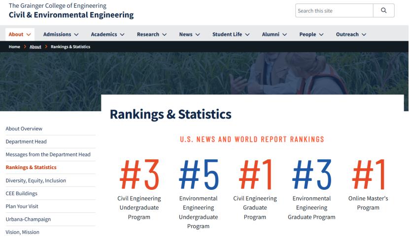 在2025年《美国新闻与世界报道》(U.S. News & World Report)排名中,其土木工程研究生专业高居全美第1位,环境工程研究生专业位列全美第3位, 专业教学、科研实力强大。