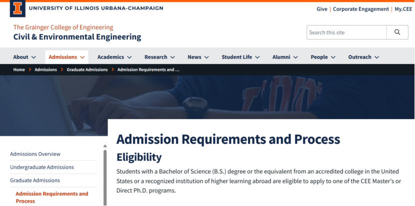 环境工程硕士要求国际申请人,具备托福总分不低于103分、雅思总分不低于7.5分水平;GRE成绩可选提交(但强烈建议),若提交,其平均录取分数为Verbal 155分、Quantitative 165分、Analytical Writing 4.0分; GPA最低要求为3.0。