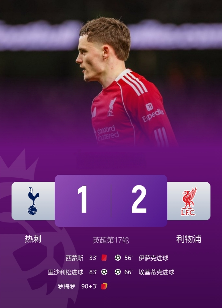 热刺1-2不敌利物浦,热刺真是输球又输人,西蒙斯比赛第33分钟直红,罗梅罗最后阶段2黄变1红离场。伊萨克替补建功,维尔茨斩获英超首个助攻,埃基蒂克连场破门!利物浦新援们发挥很不错,但利物浦被9人热刺压着打,斯洛特有点怂,临场有点差劲,赢得非常难看,也不得不说热刺是踢得真脏呀!