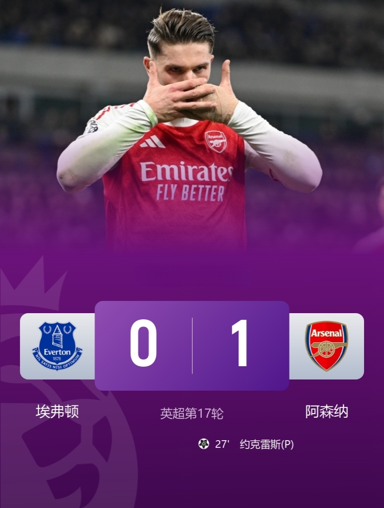 埃弗顿0-1不敌阿森纳,奥布莱恩手球送点,约克雷斯点射打破进球荒并制胜!此役暴露了阿森纳的进攻效率低下和把握机会能力不足的短板。阿森纳中前场除了哈弗茨人员齐整,但进攻打得确实很糟糕。阿尔特塔的临场是致命伤,阿森纳争冠有点不稳哦!