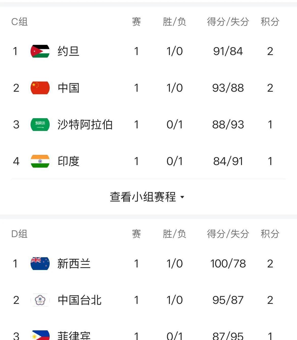 中国男篮首战仅胜5分B组的日本队赢得挺轻松,拿到了首场胜利。D组那边,新西兰队大胜伊拉克,赢了整整22分。而C组的中国男篮表现一般,只赢了东道主沙特队5分,所以第一轮结束之后,中国男篮在C组排在第二名。