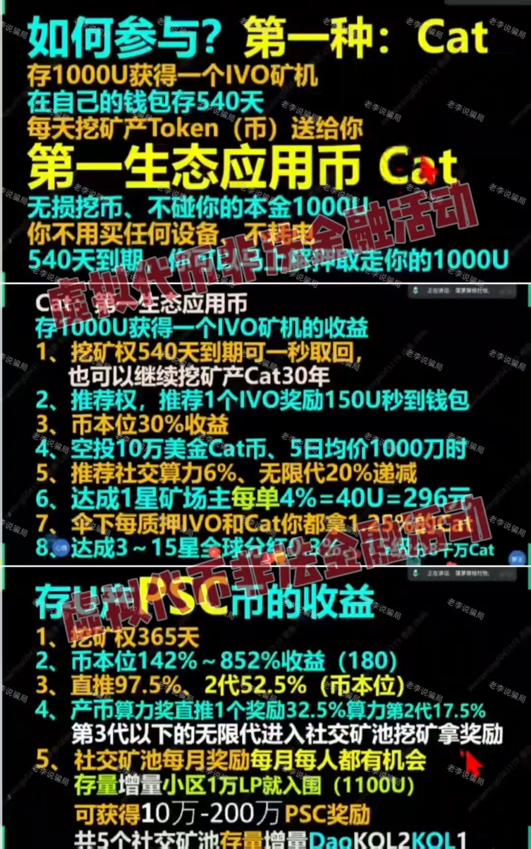 违规发行“CAT代币”,炒作“PSC”,通过“质押挖矿”模式承诺高收益。