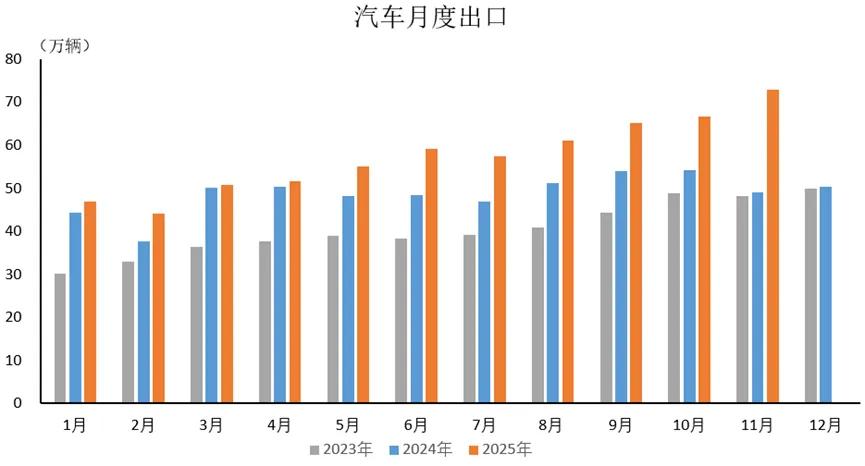 根据中国汽车工业协会的统计,今年11月,汽车出口72.8万辆,环比增长9.3%,同比增长48.5%,历史上首次单月超过70万辆。