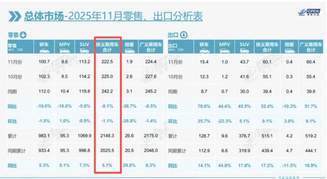 01,国内零售增长了,但利润低得可怜从总量来看还是上涨了。今年1-11月,新车累计零售2148万辆,同比增长6.1%,但同比去年的2025万辆,只增加了123万辆。