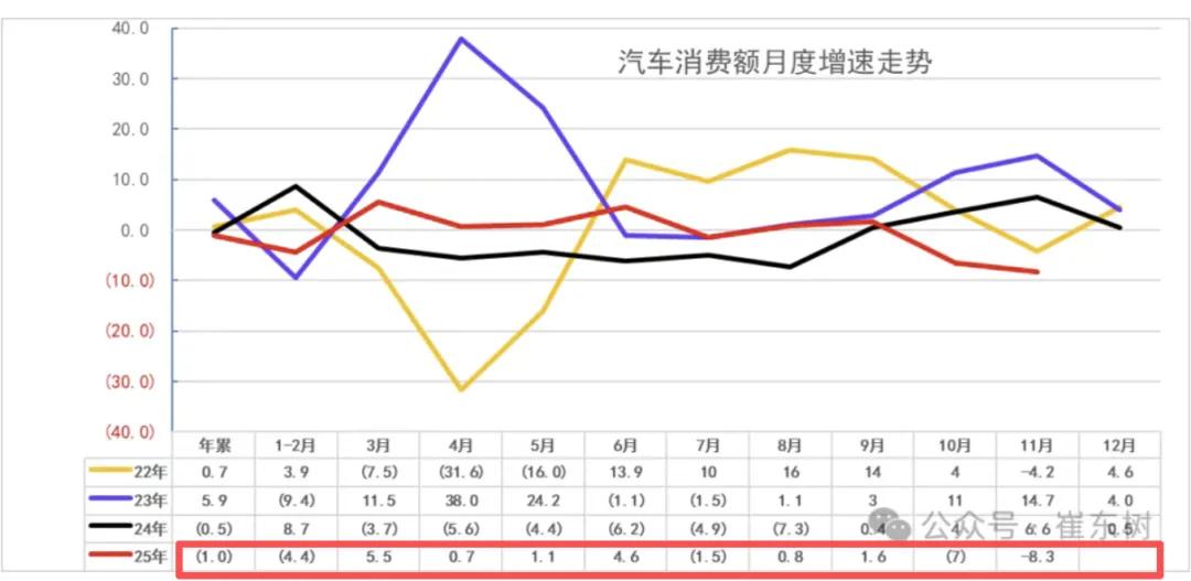 我们看看实际“疗效”。年底的11月、12月份传统的销售旺季,今年却出现了下滑,这可能预示着2026年将迎来负增长。