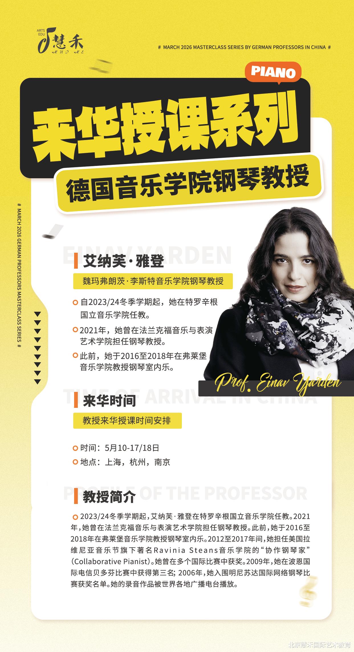 2026年5月10日-18日,德国魏玛弗朗茨·李斯特音乐学院钢琴教授——艾纳芙·雅登(Prof. EINAV YARDEN),携深厚的演奏积淀与丰富的教学经验,登陆上海、杭州、南京三大城市,开启专属中国琴童与钢琴爱好者的大师课之旅,带你解锁钢琴演奏的高阶密码!
