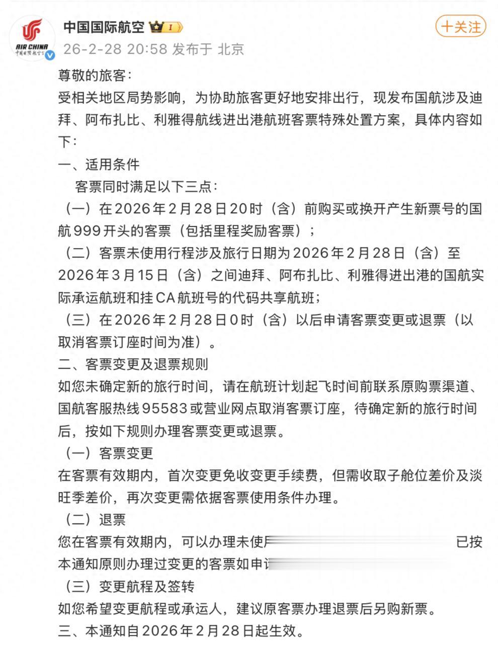 国航通知显示,旅客于2026年2月28日20时(含)前购买的机票,旅行日期在2026年2月28日至3月15日(均含当日)之间的迪拜、阿布扎比、利雅得进出港航班,可申请退票或变更,免收退票手续费,首次变更免收手续费,但需补舱位差价。