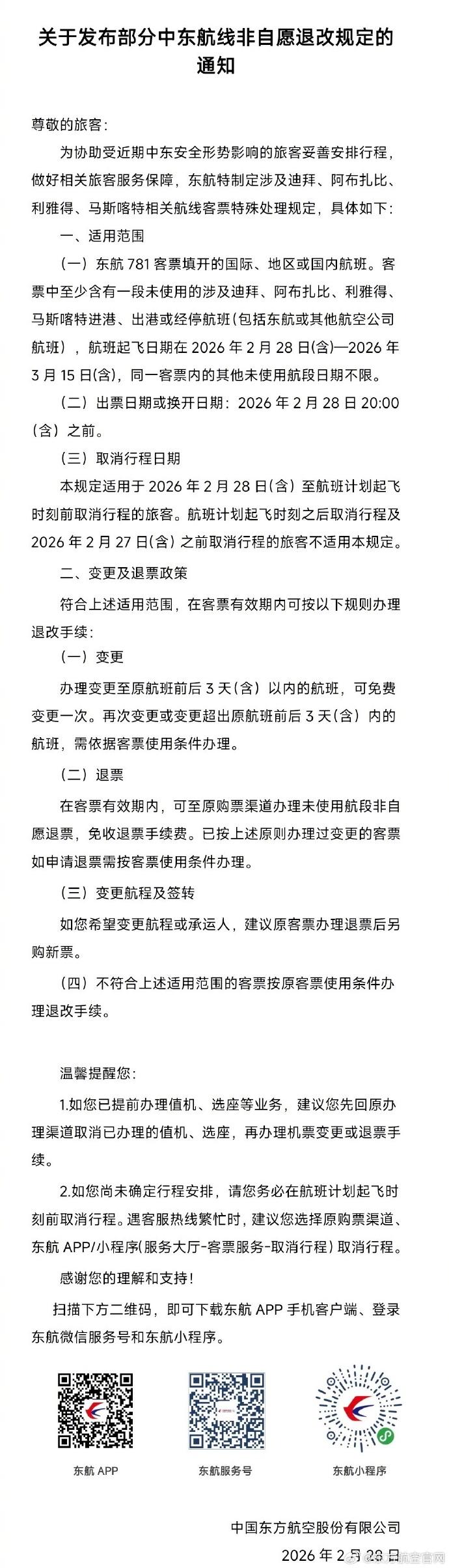 东航规定,旅客购买的机票至少含有一段未使用的涉及迪拜、阿布扎比、利雅得、马斯喀特的进港、出港或经停航班,航班起飞日期在2026年2月28日(含)至2026年3月15日(含),可免费变更一次至原航班前后3天(含)以内的航班。在客票有效期内,可至原购票渠道办理未使用航段非自愿退票,免收退票手续费。