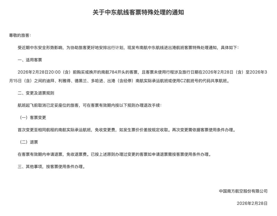 南航方案中,旅客购买的涉及迪拜、利雅得、德黑兰、多哈的进出港(含经停)航班机票,同样针对2026年2月28日20:00(含)前购买、旅行日期在2月28日至3月15日之间的机票,可免费变更一次。在客票有效期内申请退票,免收退票费。