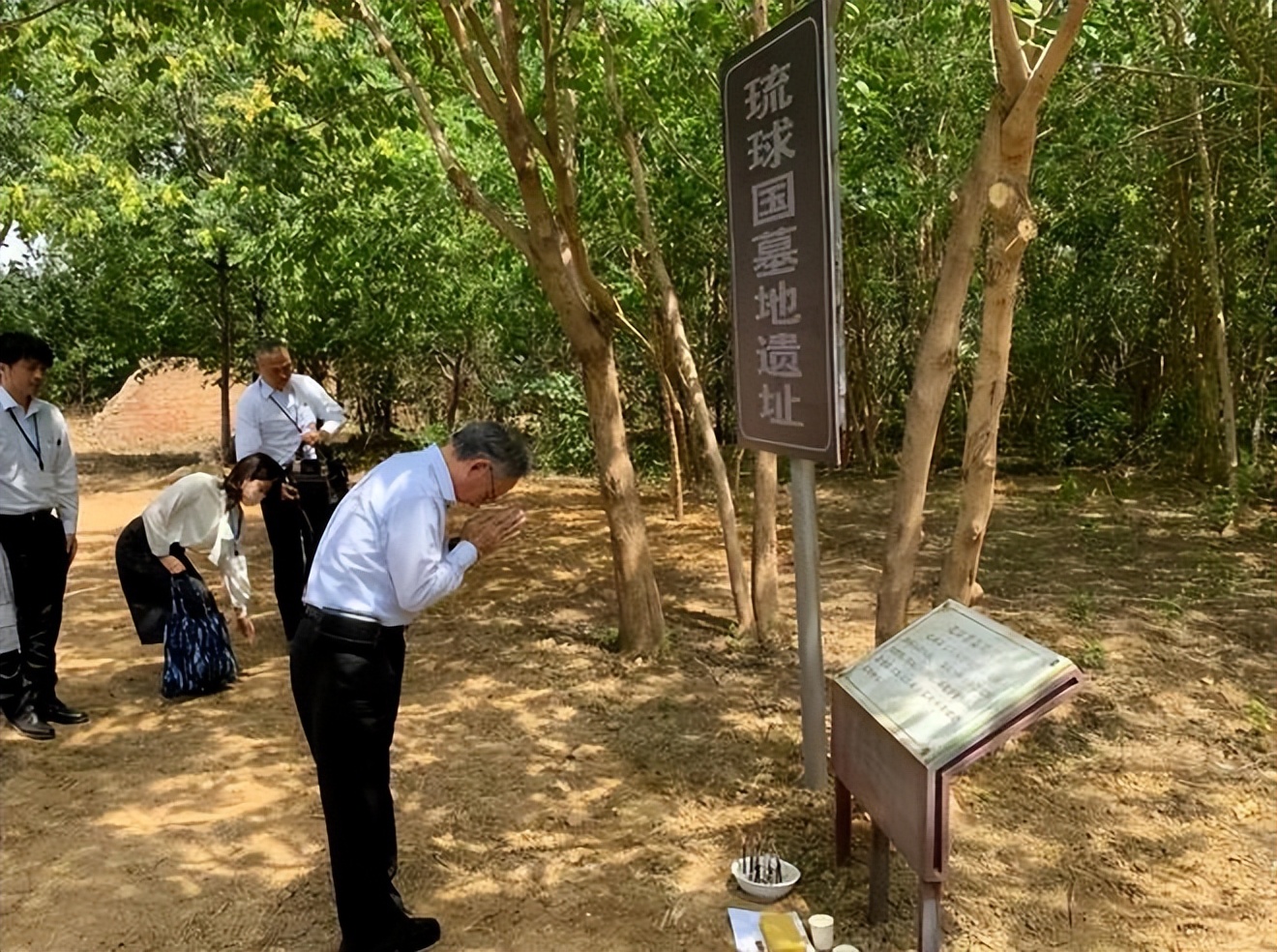 2023年7月4日,北京通州,立禅庵村。日本冲绳县知事玉城丹尼站在一座土坟前。手里拿着的香,不是日本制的,是黑色的中国香。他没按日本礼仪拍手,而是双手合十,低声祭拜。