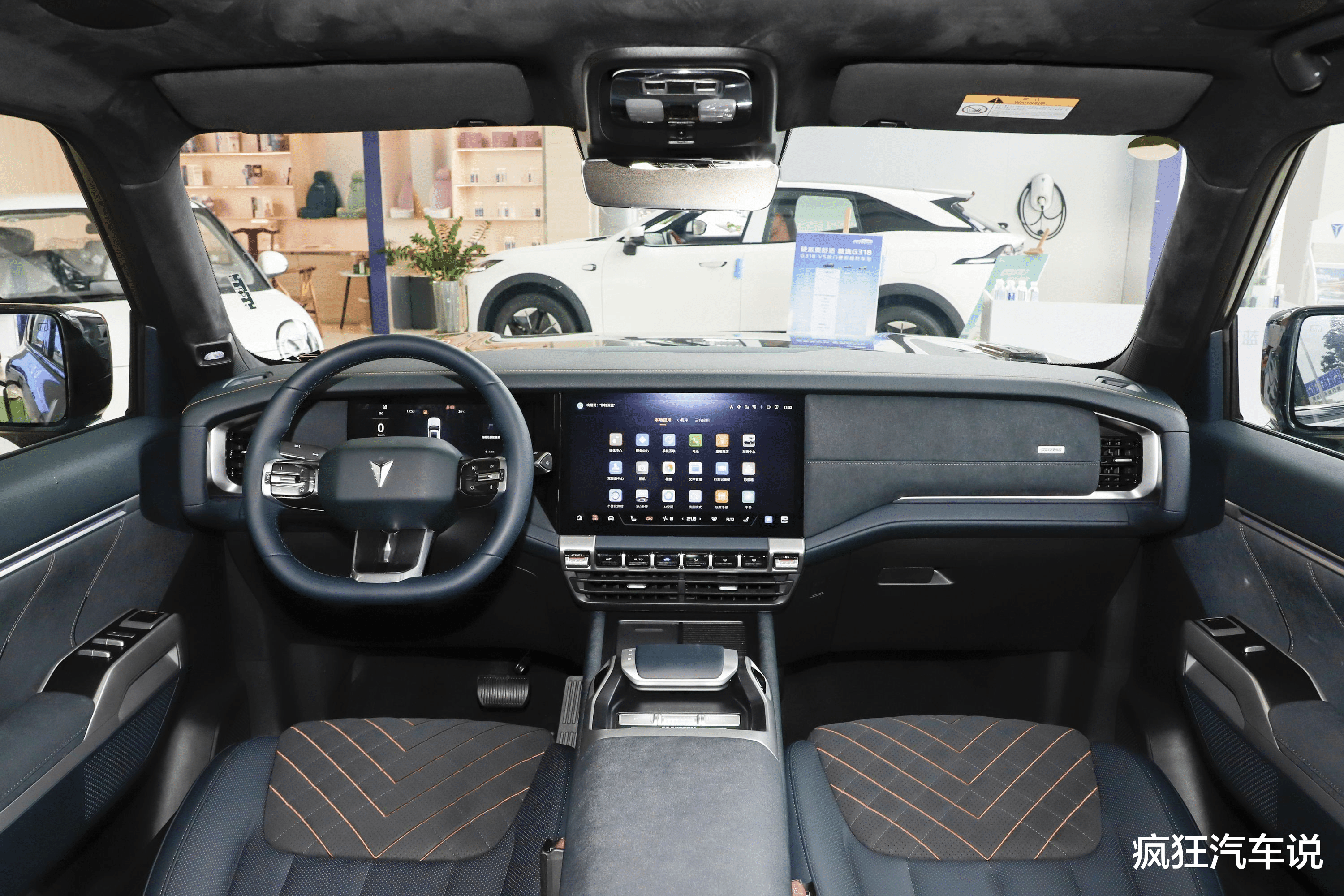 打开车门,内部布局采用对称式设计,搭配飞船式的推拉杆,深蓝G318将越野范体现得淋漓尽致。尤其是用料上,几乎是按照豪车标准打造,能够接触到的区域基本都采用了软质材料包裹,门把手、前排空调出风口也都加入了金色镀铬装饰,档次感远胜同级别一众车型。同时配备了14.6英寸中控大屏+12.3英寸的全液晶仪表盘,内置Deepal OS车载智能系统,不仅拥有可见即可说的人机互交能力,还能多指飞屏操控,手机无线充电等等,追求高科技氛围感的朋友有福了。