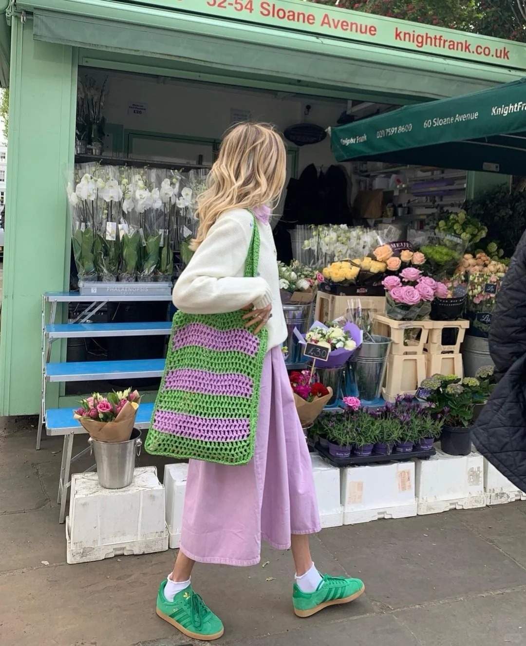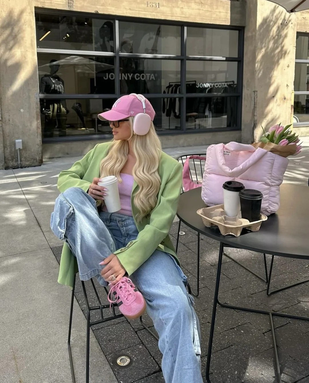穿粉色衬衫时,搭配绿色鞋子、绿色棒球帽撞色▼