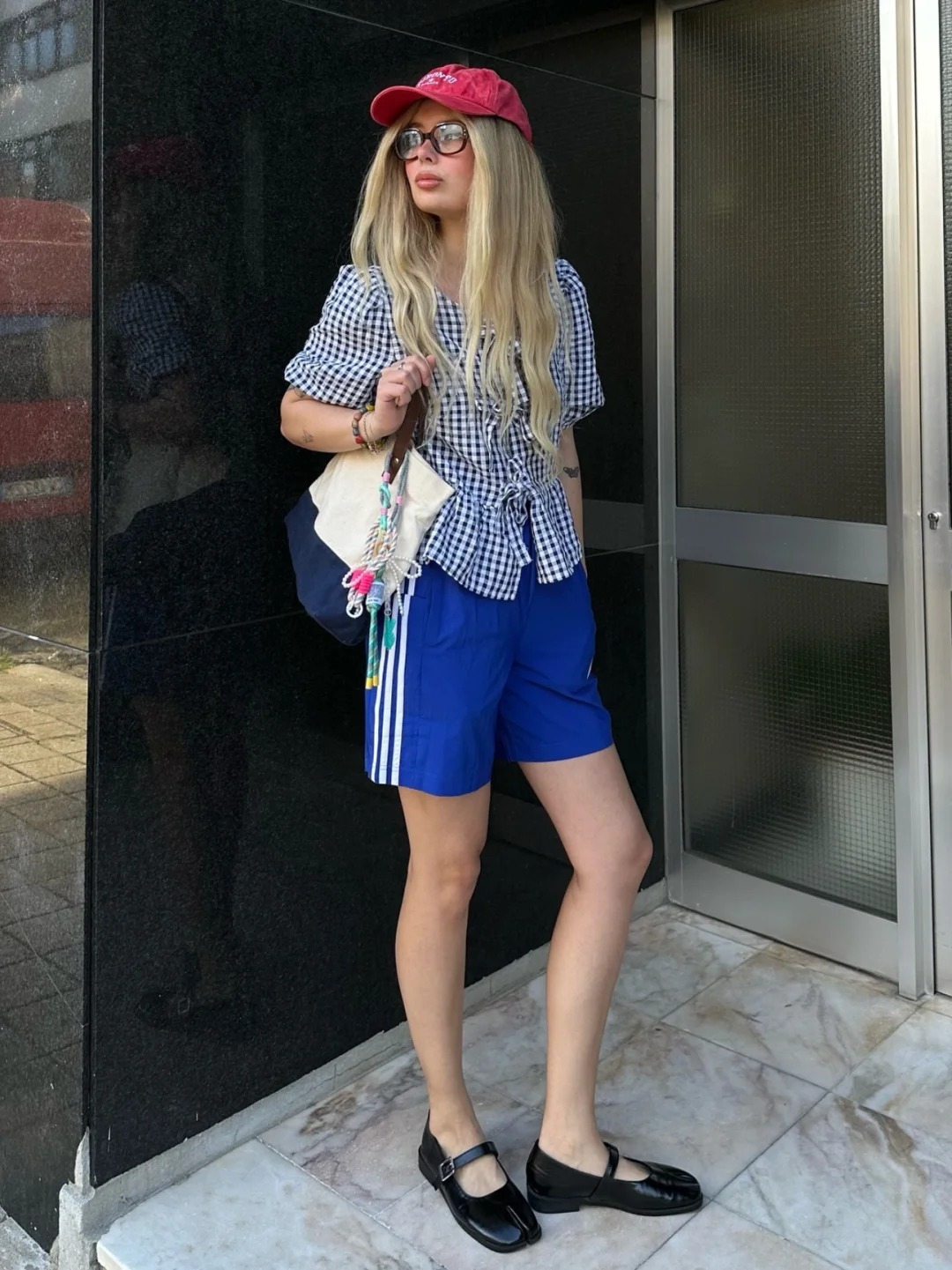穿红色格纹吊带衫时,可以配一条蓝色牛仔半裙,再搭配红色鞋子、包包、腰带与吊带衫呼应起来。
