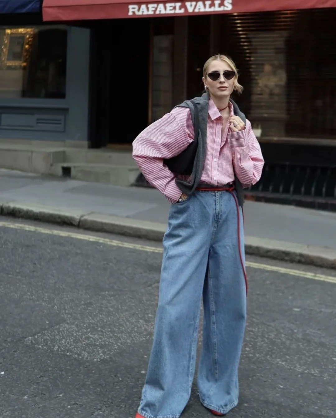 红色是一种充满活力和热情的颜色,红色衬衫与蓝色牛仔裤形成鲜明的对比,使整体造型更加醒目。