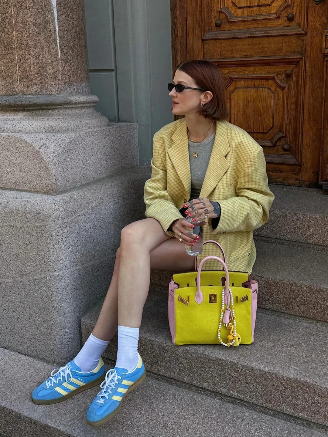 饱和度高的对比色,可以采用9:1的比例来搭配,比如绿色背心和红色小包包撞色▼
