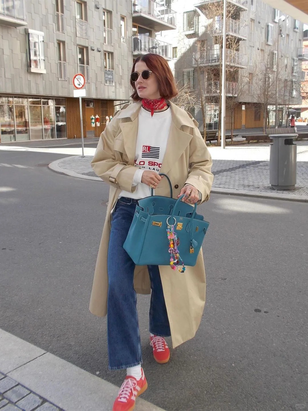 选择同色的小件单品来搭配,让它们隔空呼应起来,一点点亮色就可以提亮整个Look。