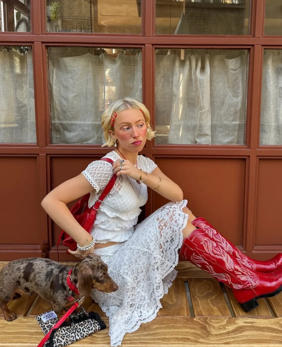 宽松的蓝色夹克与红色半裙的组合,形成了鲜明的色彩对比,红色鞋子与红色发箍的点缀,更是巧妙地与半裙相呼应,提升了整体的协调性和亮点。