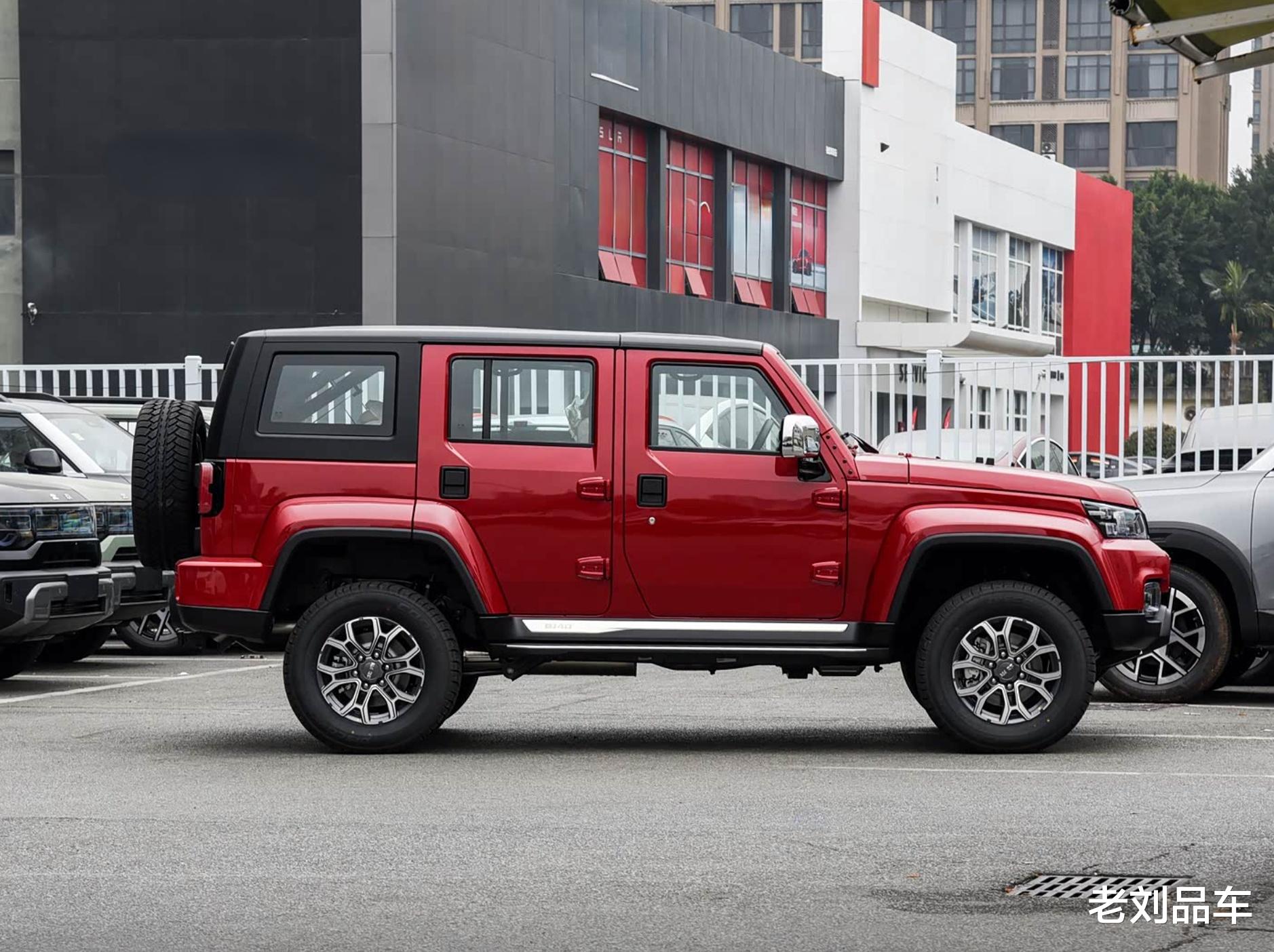 外观方面,前脸还是BJ40标志性的五孔式格栅,两侧LED大灯与亮黑色中网连为一体,整体性很强。前包围的硬派造型,搭配内置的红色前拖车钩,辨识度很高。侧面是四门车身结构,顶棚支持拆卸。长宽高分别为4630*1925*1871mm,轴距2745mm,非承载式车身,保证了越野所需的刚性。比去年7月上市的2026款,各方面尺寸更短一些,比如车高低了78mm,轴距短了15mm。17英寸轮圈搭配AT越野轮胎,外扩幅度很大的轮眉,能有效避免烂路剐蹭,整体看起来非常紧凑。