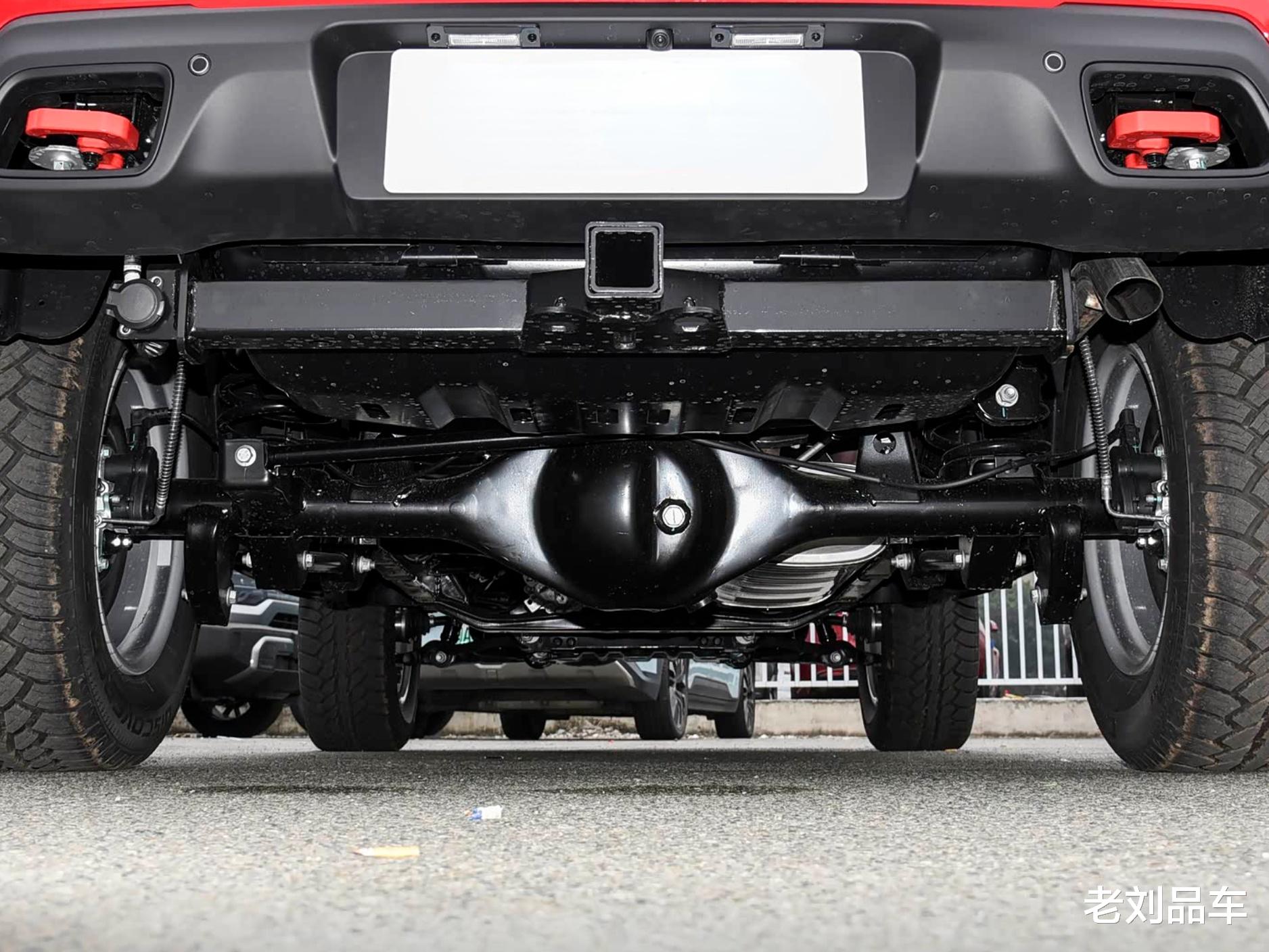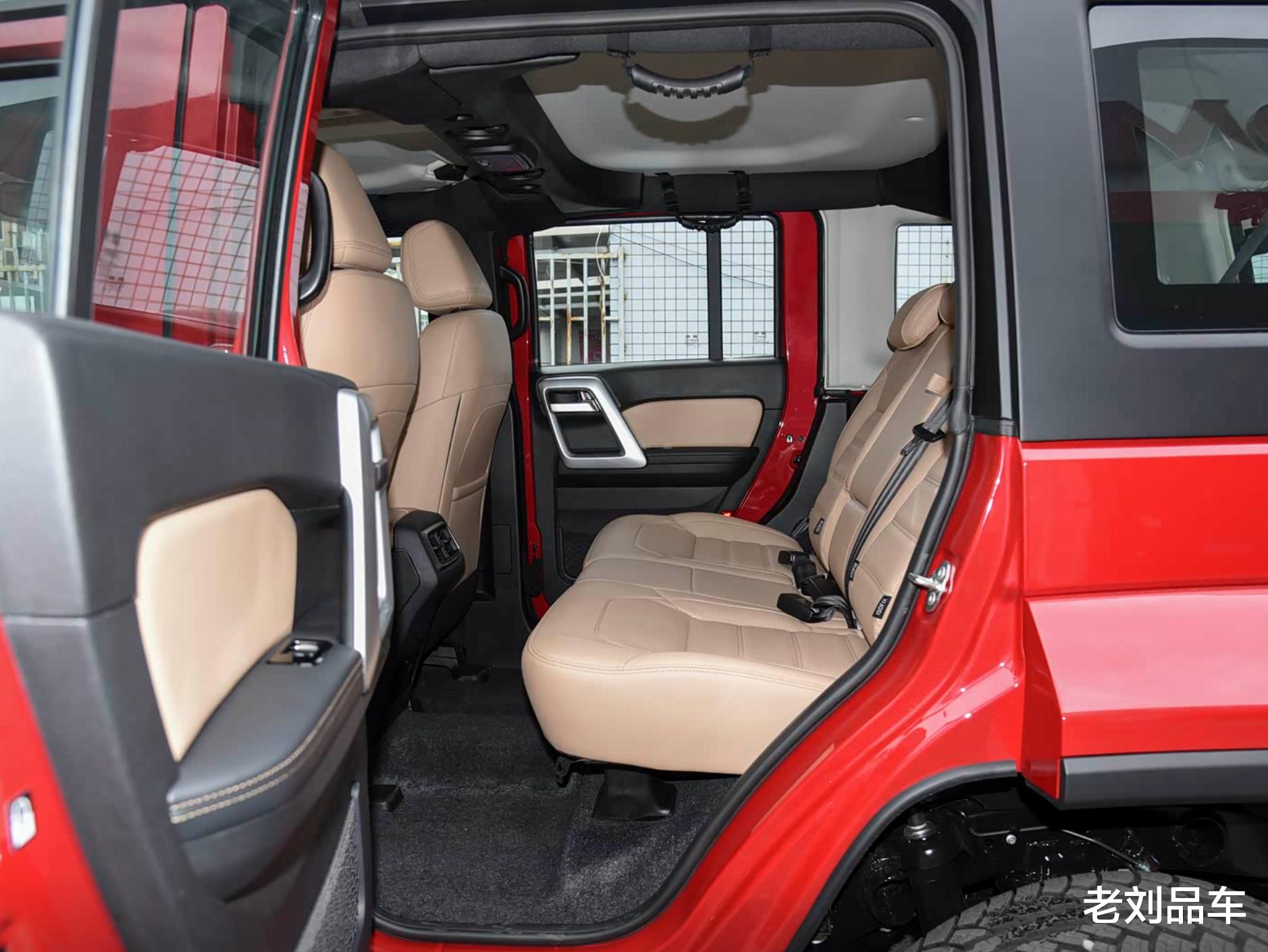 车尾部分,高位刹车灯、后雨刷一应俱全。背挂式后备胎,是硬派SUV的标志性设计。后备箱门采用侧开式,还配备了红色双侧拖车扣和中置拖车钩,原厂自带拖拽资质。后备箱常规容积532升,放倒后排可扩展至965升,比停产在售领克01零的基础容积更大,但扩展容积有限。