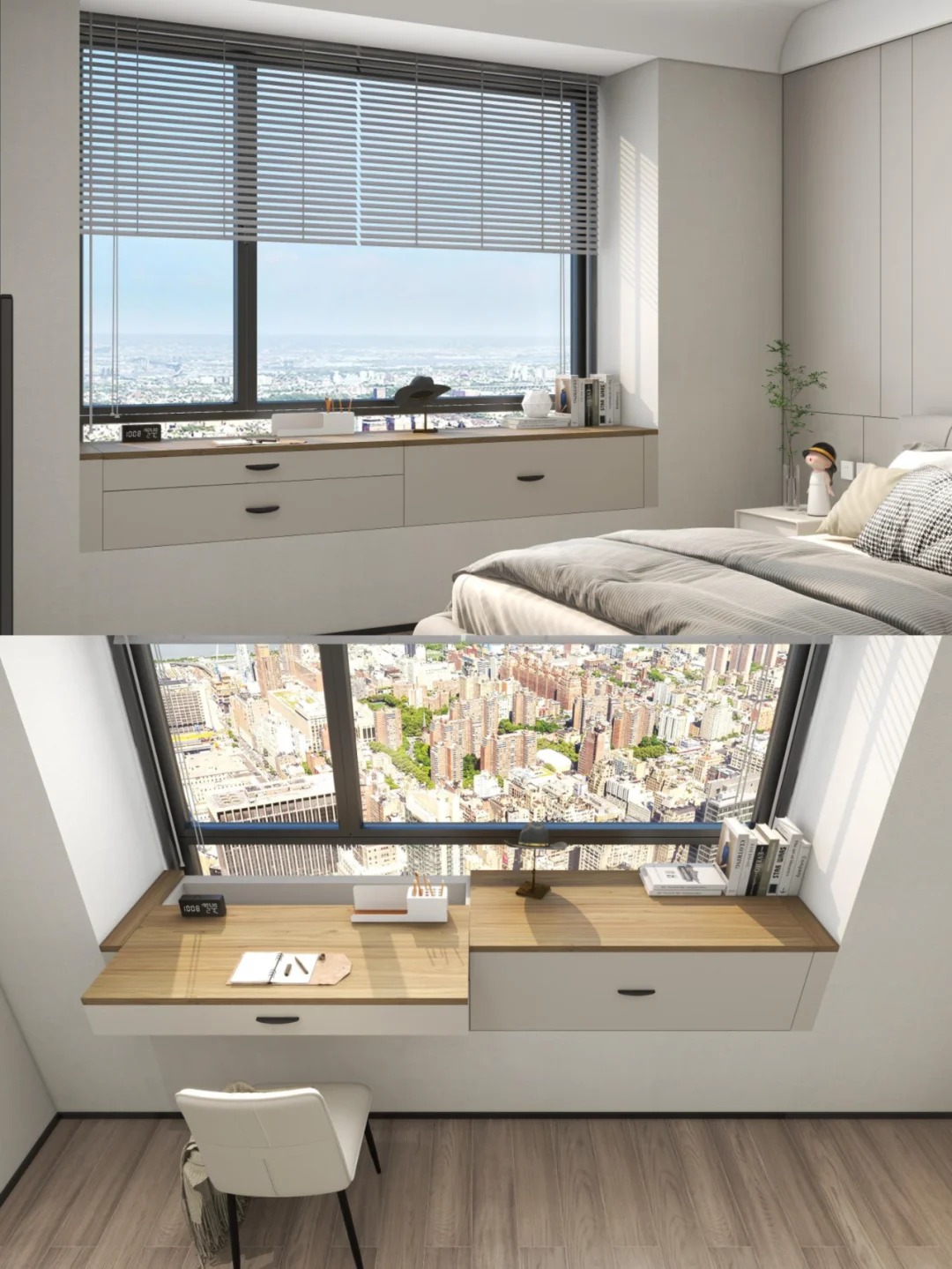 对那些热衷于在自然光下化妆的姐妹来说,这简直是闭眼入的选择!悬浮式的梳妆台向飘窗方向延伸,不仅拓宽了桌面,还丝毫不占用过道空间。而且,把飘窗改造成收纳柜,瞬间提升卧室的储物功能,让你的各种化妆品都能找到归处。