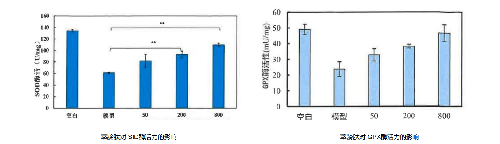 50+肌肤易受自由基氧化与蛋白质糖化损伤,萃龄肽中的肌肽可通过清除自由基、保护线粒体功能减少氧化损伤,同时阻断胶原蛋白与糖分的交联反应,维持肌肤弹性。实验数据显示,经800μg/ml萃龄肽处理的UVA损伤细胞中,超氧化物歧化酶(SOD)活性提升179.65%,谷胱甘肽过氧化物酶(GPX)活性提升197.17%,抗氧化能力显著增强。