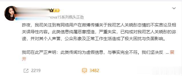 几乎就在同一时间,关晓彤工作室的态度特别强硬,直接说和王安宇的恋爱传闻是“纯属恶意捏造,严重失实,已经构成诽谤”。