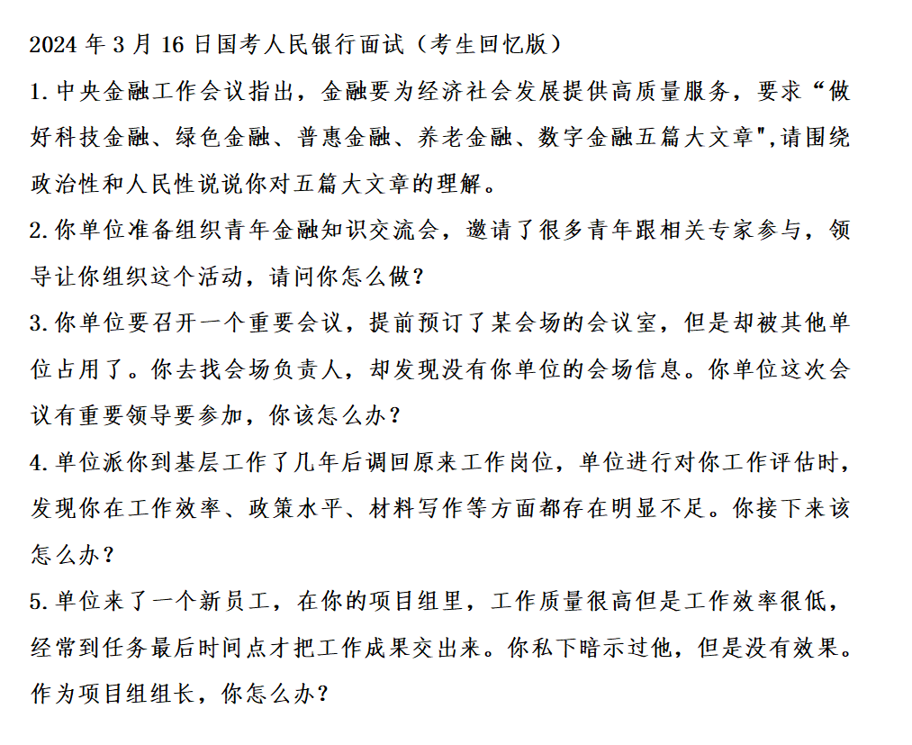 2024年3月16日国考中国人民银行面试真题(回忆版)