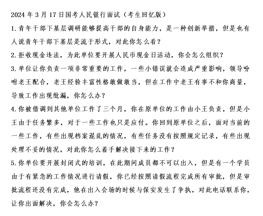 2024年3月17日国考中国人民银行面试真题(回忆版)