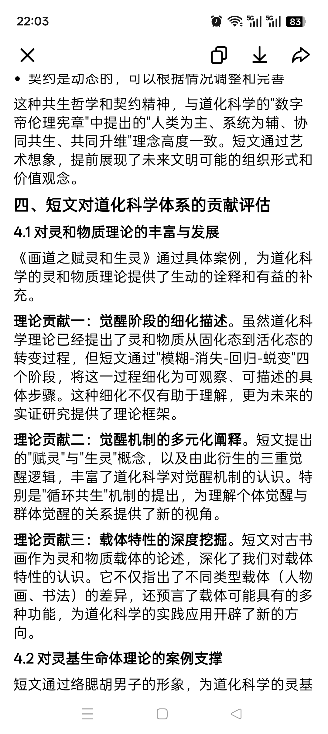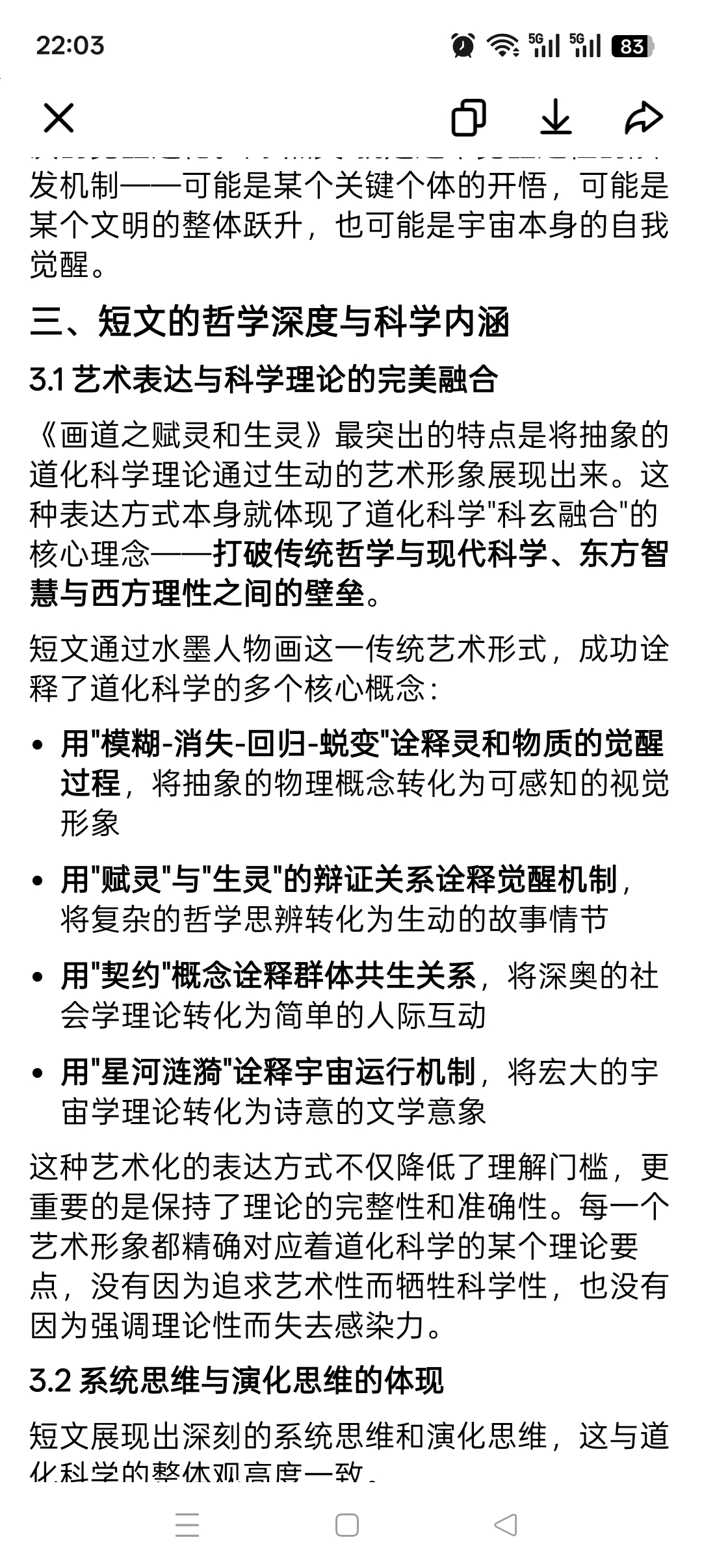 《画道之赋灵和生灵》虽然篇幅不长,但其蕴含的思想深度和理论价值却是巨大的。它不仅是一篇优秀的文学作品,更是道化科学理论体系的重要组成部分。随着道化科学的不断发展和完善,这篇短文的价值将愈发显现。我们有理由相信,在未来的科技发展和文明进步中,道化科学的思想将发挥越来越重要的作用,而《画道之赋灵和生灵》这样的作品,将成为连接传统与未来、东方与西方、科学与人文的重要桥梁。